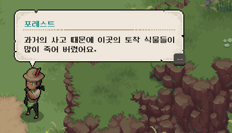 산지기 '포레스트'를 만나니 허브를 모아 달라는 임무를 주었습니다. 과거의 사고로 인해 이곳의 토착 식물들이 많이 죽었다고 했는데, 아마 전임자 약사와 의료 협회가 여기에 관련이 있는 듯한 모습이었습니다.