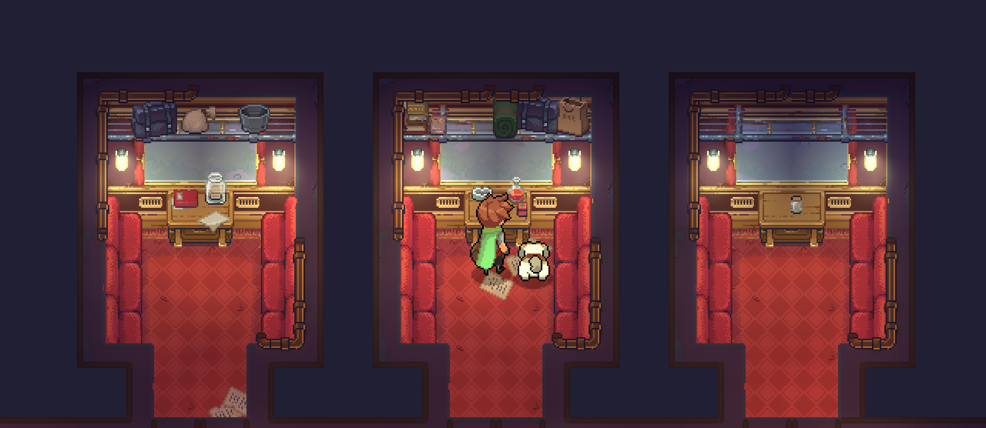 게임을 시작하면 기차를 타고 기다리는 한 청년이 있습니다. 바로 우리가 플레이를 하게 될 주인공입니다. 옆에는 귀여운 멍멍이 한 마리도 같이 있네요.