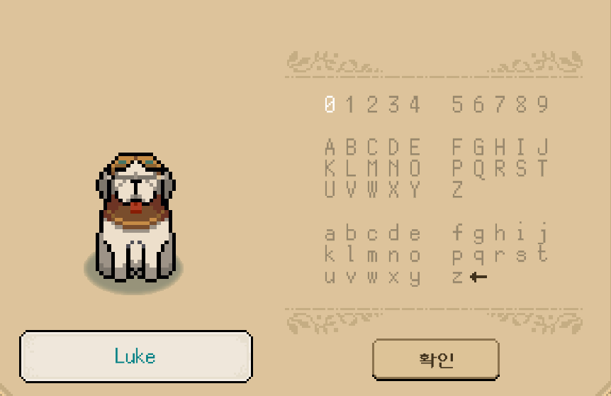 그리고 같이 다니는 멍멍이의 이름도 지어줄 수 있습니다. 고민을 하다가 적당히 '루케'로 이름을 지어주었습니다. 아쉽게도 아직까진 한글 이름이 지원이 되지 않더라고요.