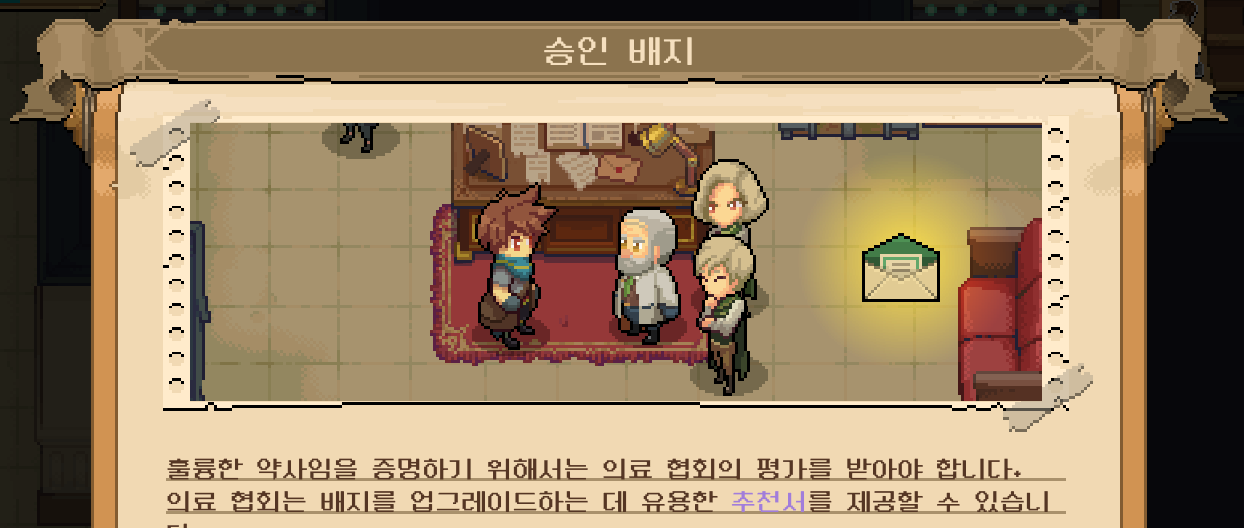 문버리 시장을 통해서 배지의 레벨을 올리고 있고, 업그레이드를 위해서는 의료 협회의 추천서가 필요합니다. 더 깊은 곳을 가기 위해서는 추천서를 받고 업그레이드를 하는 것이 전체적인 과정이라 할 수 있겠습니다.