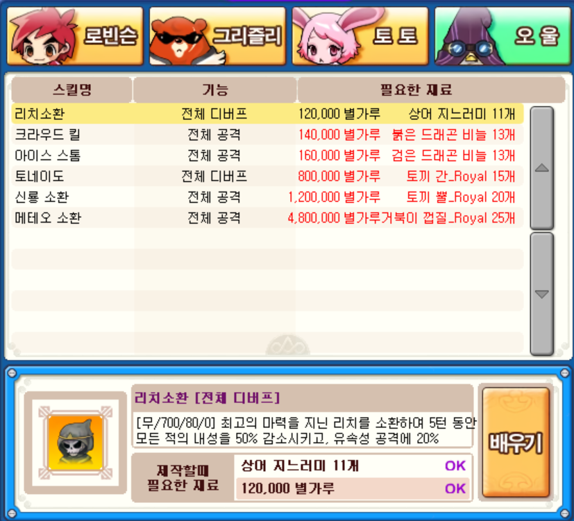 재료를 모아서 새로운 스킬도 배웠습니다. '매스 메가힐링'은 전체 힐이기 때문에 유용하게 써먹을 수 있고, '리치소환'은 적의 속성 내성을 절반을 깎아버리기 때문에 후반에서도 계속 쓰이는 스킬이라 할 수 있습니다.