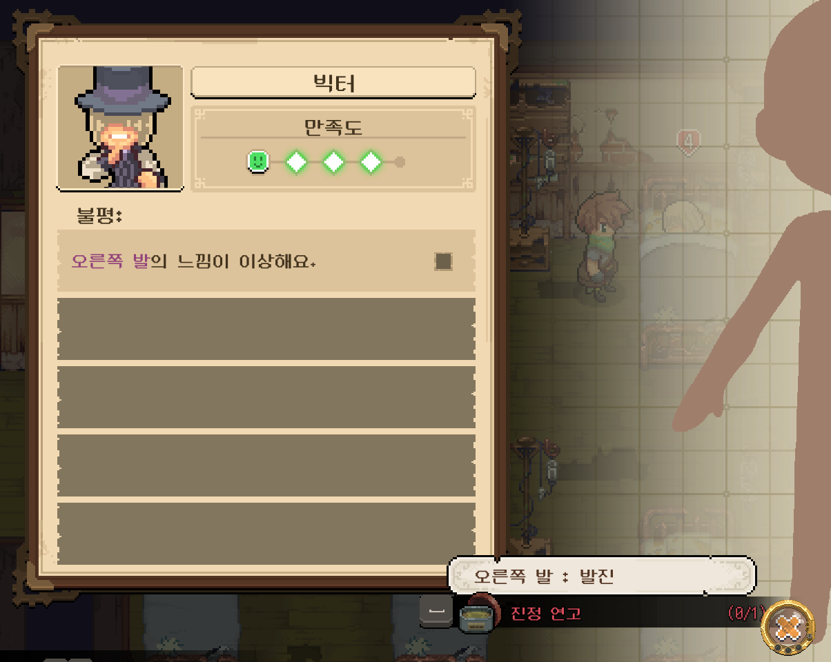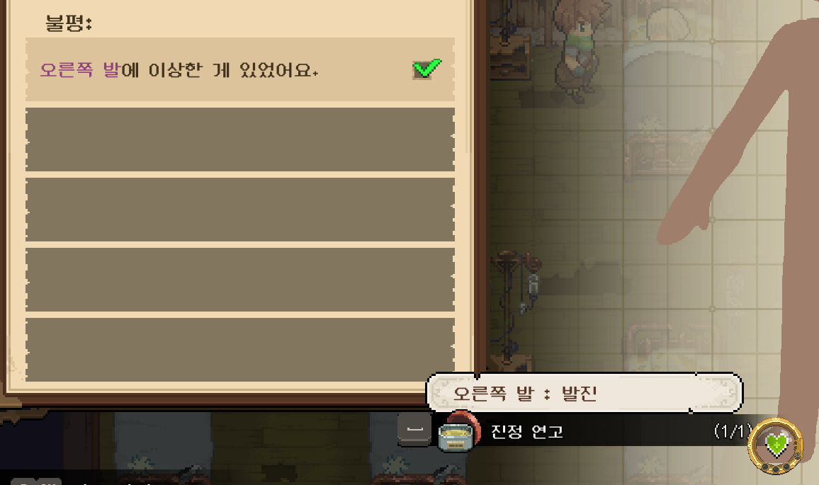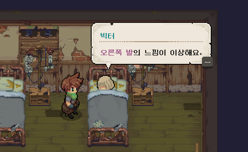 마을을 돌아다니면서 한 두번 봤던 NPC '빅터'가 실려왔습니다. 증상에 대해 물어보니 '오른쪽 발'의 느낌이 이상하다고 합니다.