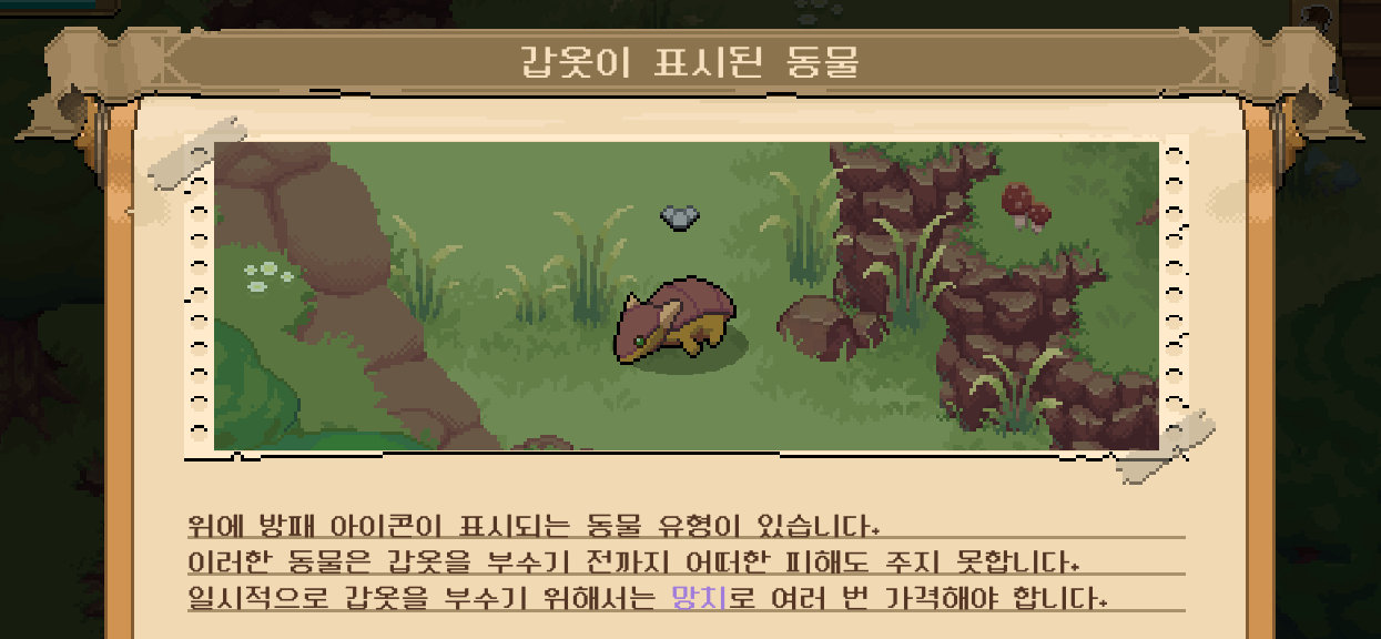 여기서부터 새로운 타입의 몬스터가 나오는데 두꺼운 갑옷을 입은 몬스터가 나옵니다. 망치로 몇 대 두들겨야 갑옷이 깨지는데, 그러면 몬스터가 드러눕기 때문에 잡기는 쉬운 편입니다.