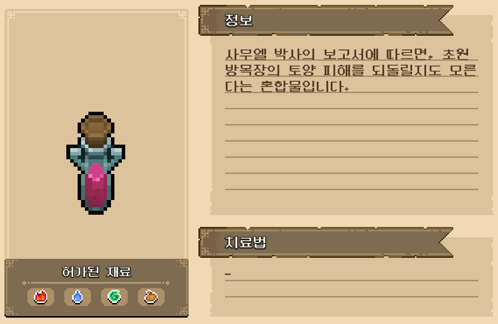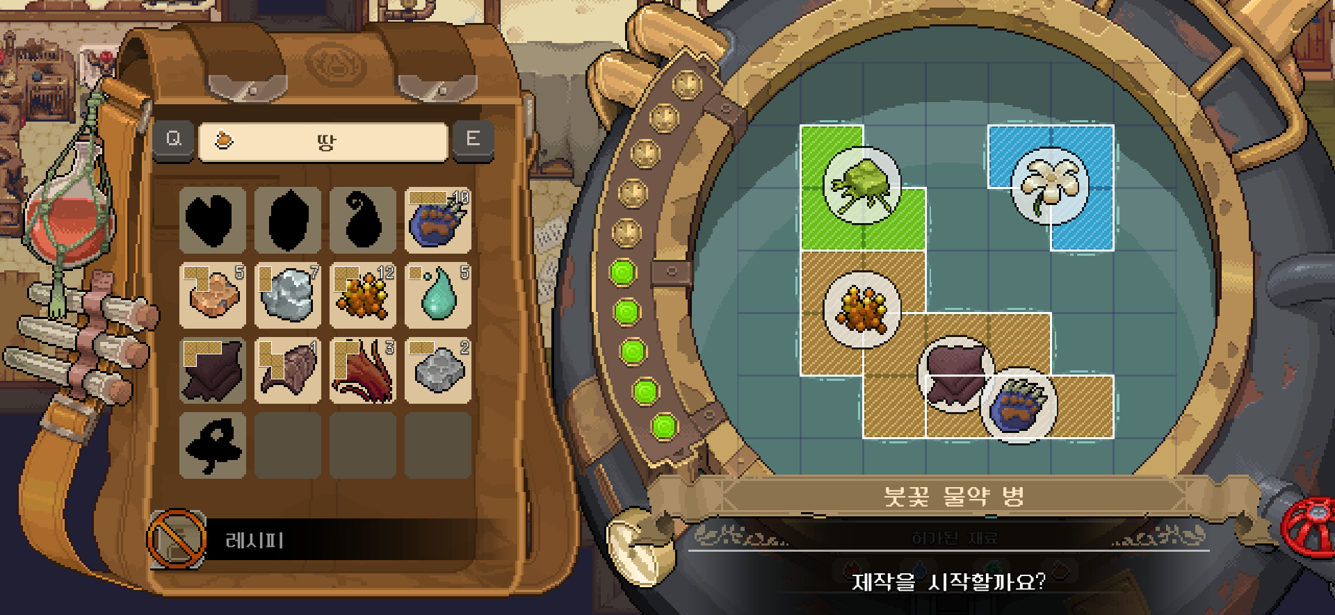 바로 레시피를 받아 들고 물약을 만들었는데 솥 최대 크기인 5칸을 꽉꽉 채워 넣어서 겨우 완성할 수 있었습니다. 이제 슬슬 솥의 양도 한계가 와서 빨리 업그레이드를 해야 할 것 같네요.