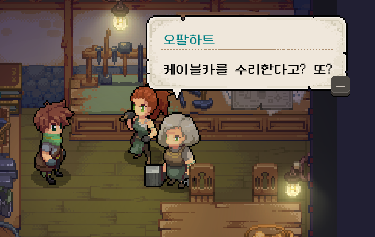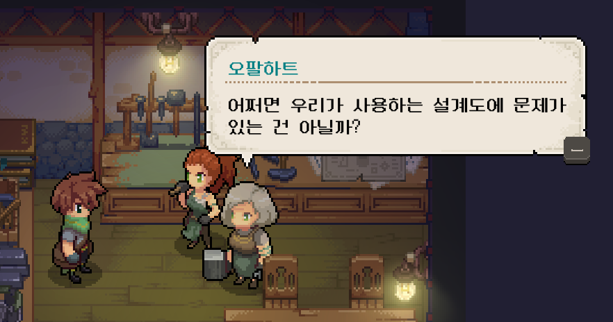 대장장이 오팔하트는 예전에 수리를 했는데 또 수리를 해야 한다며 거절당할 뻔했지만 어쩌면 설계도의 문제가 있는 것이 아닌가라는 새로운 가설을 제안합니다.
