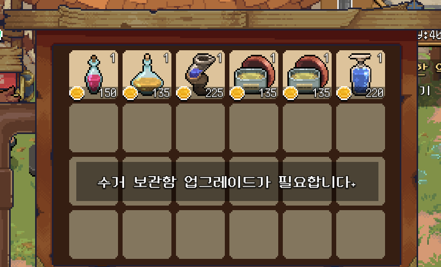 이제 골드 수급은 비교적 쉬워졌기 때문에 이제는 물약을 만들 약재와 목재, 석재만 어떻게든 잘 구하면 순조롭게 게임을 해나갈 수 있지 않을까 싶습니다.