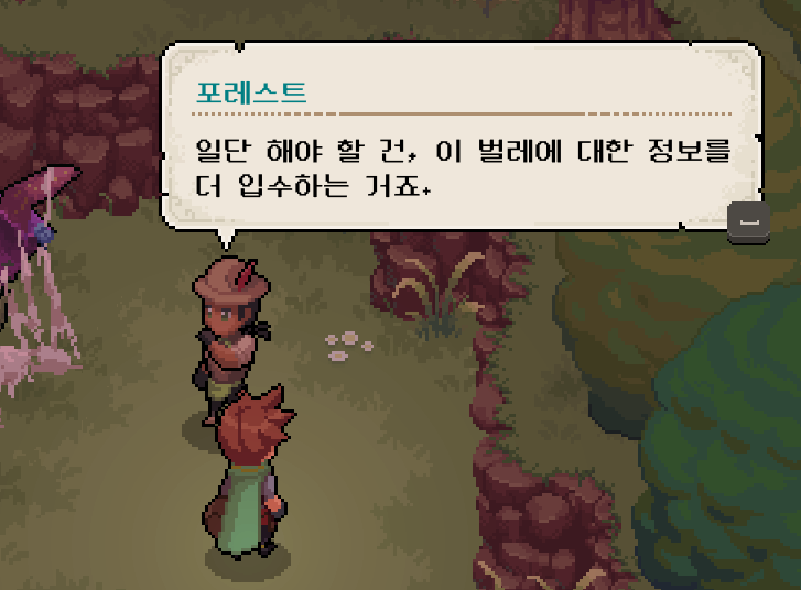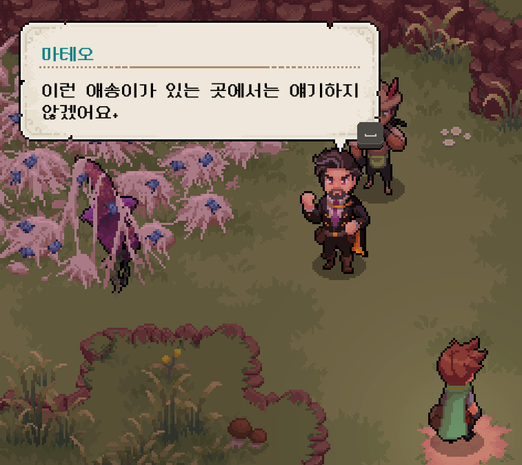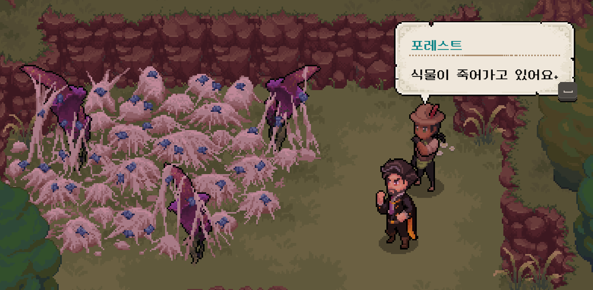 온천을 하고 난 후 재료 수급을 위해 더 깊숙하게 들어가는 도중 죽어가고 있는 식물을 보게 되었습니다. 처음에는 산지기 포레스트와 주술사 마테오의 모습을 보여주는데
