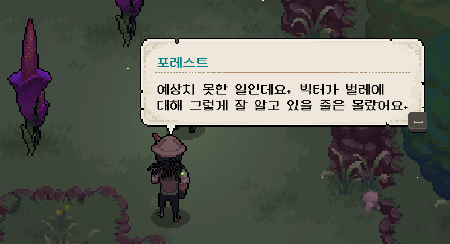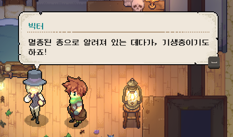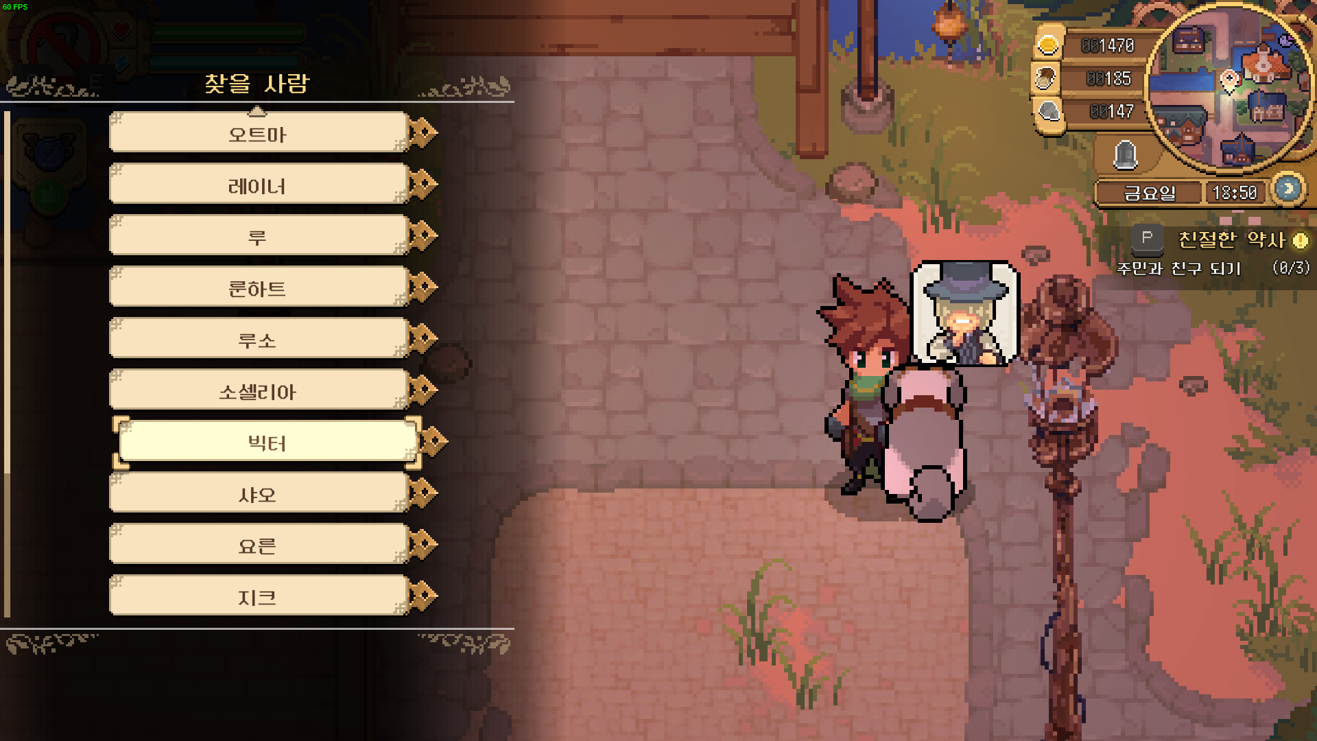 이게 여기서 좋은 기능을 사용할 수 있는데 바로 같이 동행하는 개를 통해서 NPC를 찾을 수 있습니다. 벌레 정보를 찾기 위해 '빅터'를 고르고 확인을 누르면