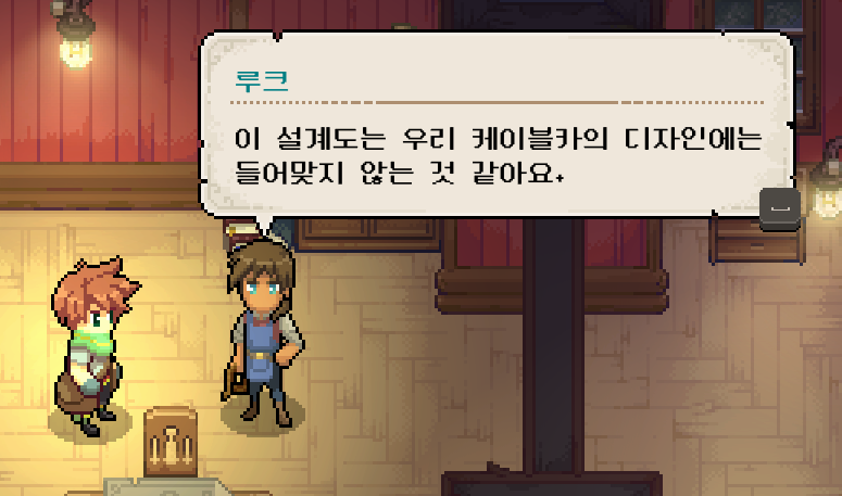 아무튼 루크는 이 설계도는 마을에 있는 케이블카의 디자인이 들어맞지 않는 것 같다며, 직접 부품 디자인을 살짝 바꿔서 다시 건네주었습니다.