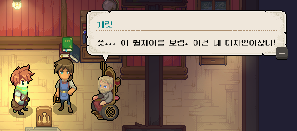 설계도의 문제를 알아보기 위해 NPC '루크'를 찾아갔습니다. 무슨 능력이 있나 궁금했는데 루크 아버지의 휠체어를 직접 만들었다는 것을 보고 신뢰하기로 했습니다.