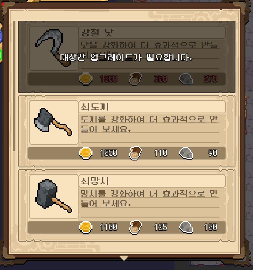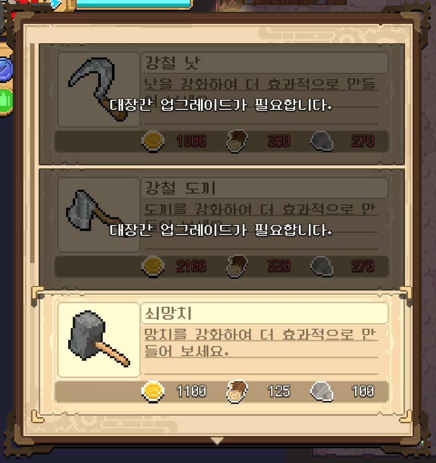 그렇게 다음 날 일어나서 바로 대장간으로 향했습니다. 겨우겨우 재료를 모아 도끼와 쇠망치를 업그레이드했습니다. 재료를 꽤나 많이 모아서 그런지 한 번에 다 할 수 있었네요.