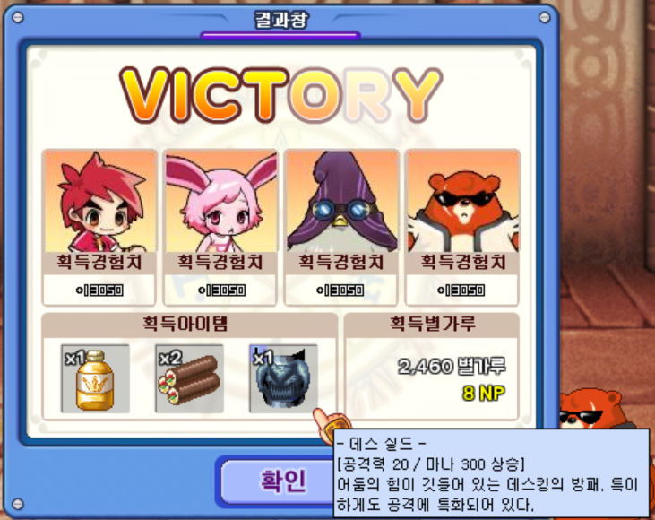 그렇게 데스킹을 잡는데에 성공했습니다. 보스 아이템으로 '데스 실드'를 받을 수 있었는데, 아무래도 보스전보다는 로빈슨, 그리즐리가 노가다 할 때 사용하면 괜찮을 듯한 아이템입니다.