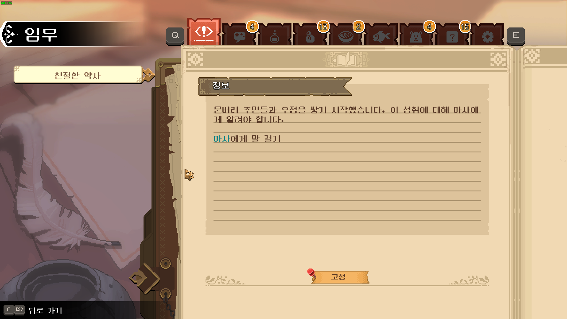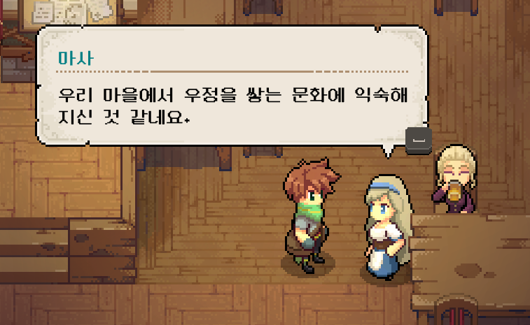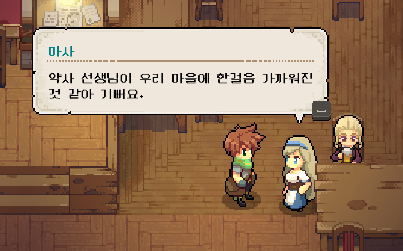 완료 조건을 달성하고 '마사'를 찾았습니다. 게임 초반 마을 사람들에게 무시 당한 것을 생각하면 약사 이미지가 많이 좋아지기는 했구나라고 느껴지긴 합니다.