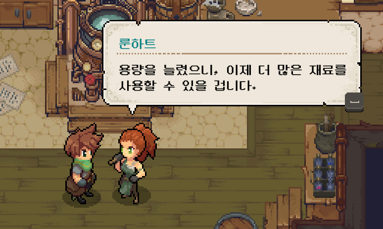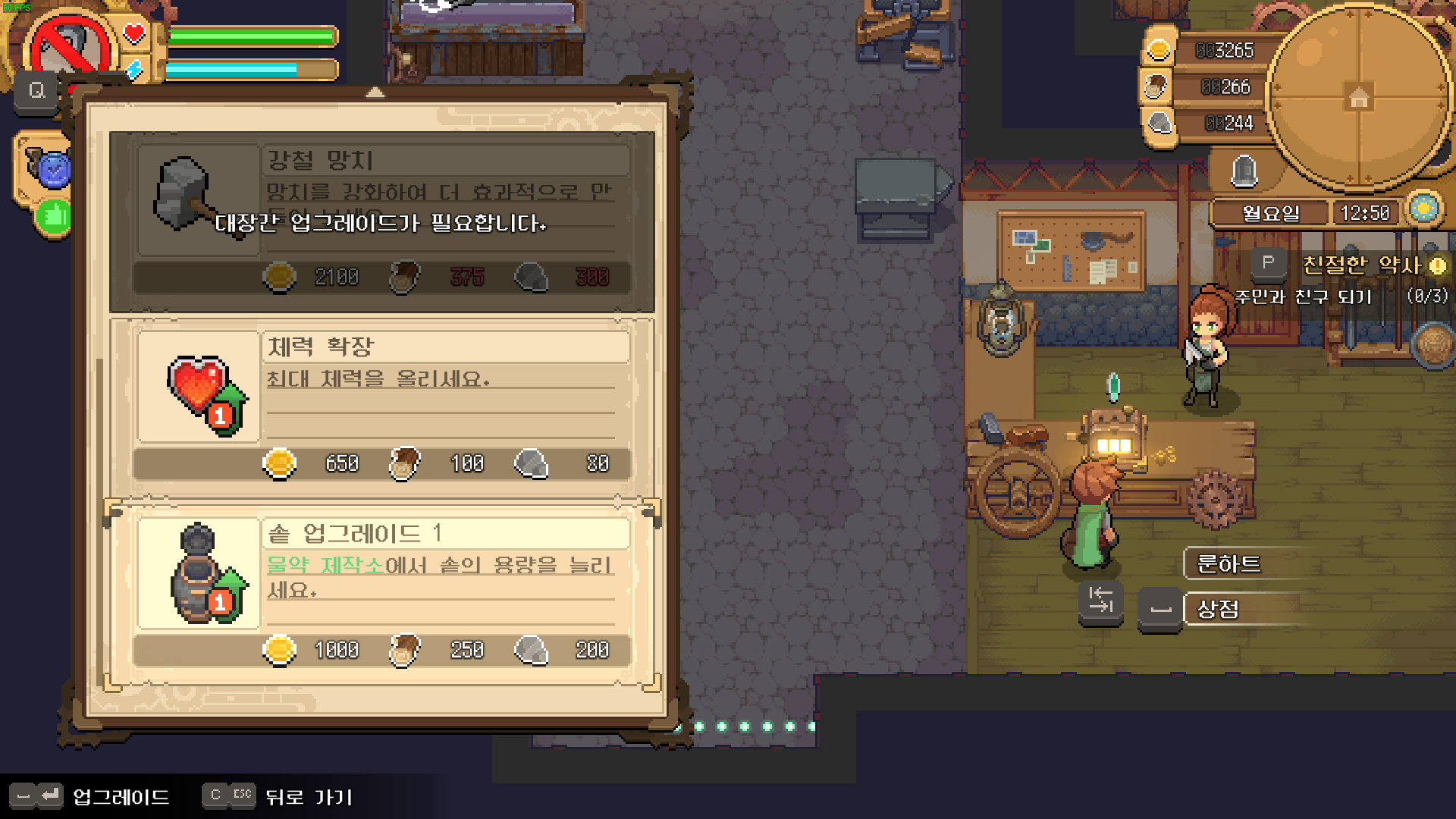 그리고 그 사이에 재료를 꾸준하게 수급을 해서 최대 체력도 확장할 수 있었습니다. 그렇게 도구와 솥, 체력까지 한 단계씩 업그레이드 할 수 있었습니다.