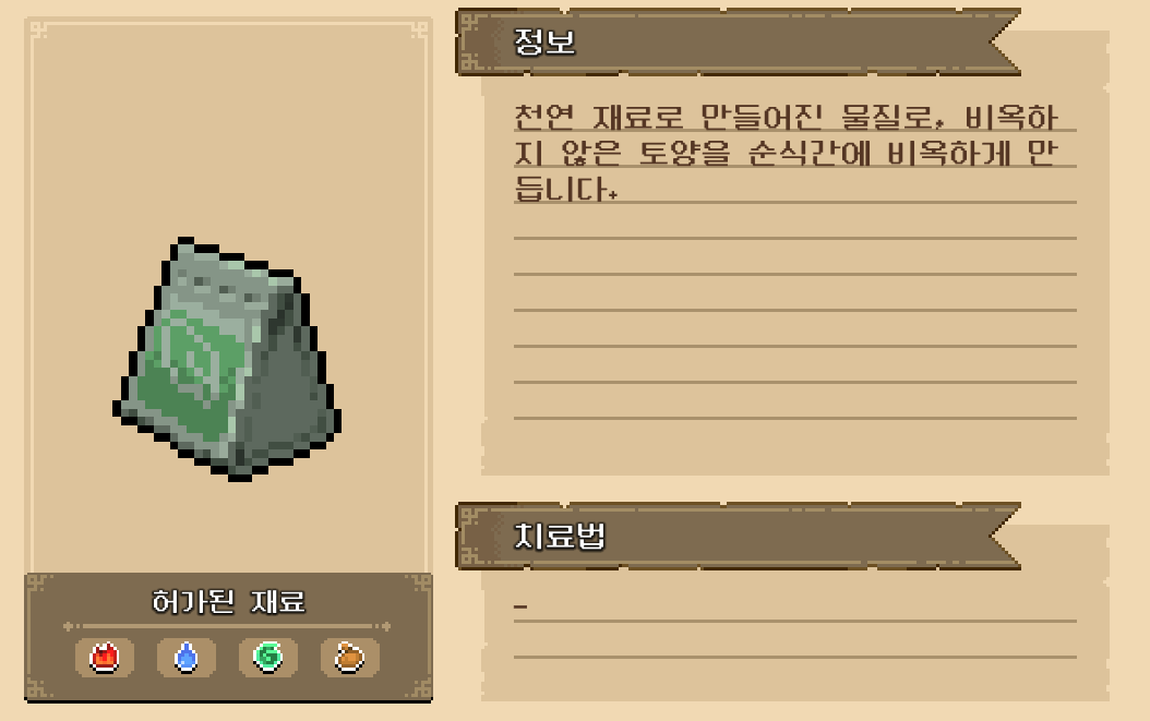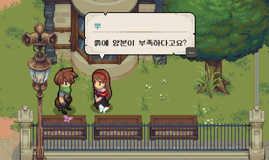 식물이 잘 자리기 위해서는 양분이 필요하다는 조언을 해주고, 토양 비료를 만들어서 건네주면 되는 이벤트였습니다. 토양 비료는 물약 만드는 것과 동일하게 재료를 얻어서 만들 수 있었습니다.