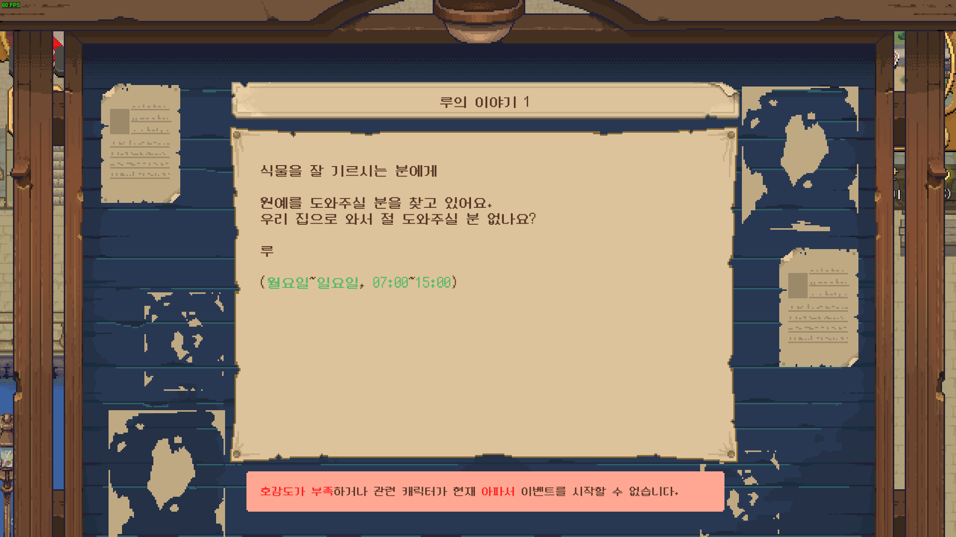 평소에 계속 재화 수급만 해서 그런지 이런 식으로 밀린 호감도 이벤트가 꽤나 많았습니다. 이번에는 마이어 시장 딸인 '루'와 관련된 이벤트입니다.