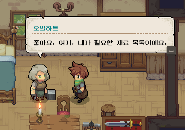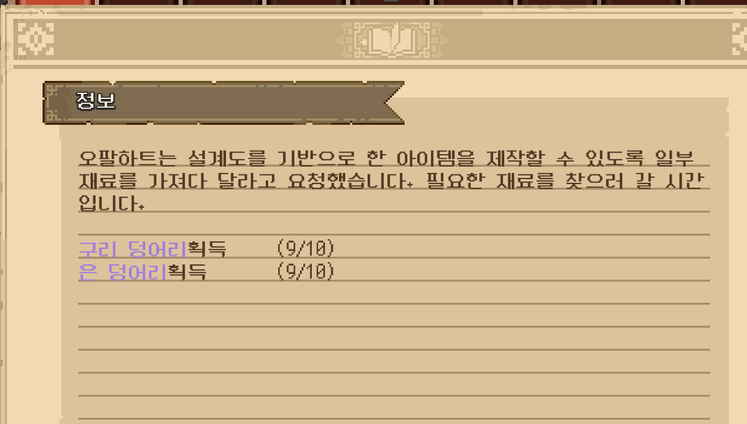 이제 케이블카 수리를 위해 오팔하트를 찾아가니 필요한 재료를 모아 오면 된다고 해서 퀘스트 창을 열어봤는데... 구리와 은이 각각 1개씩 부족했습니다.