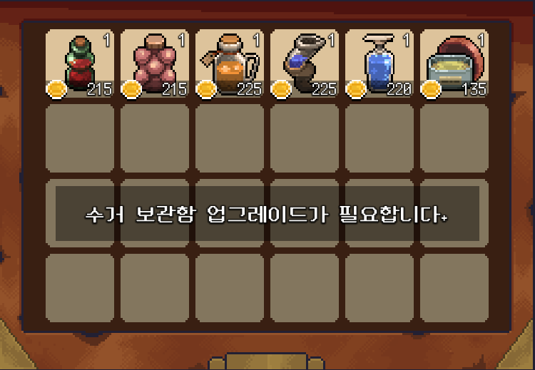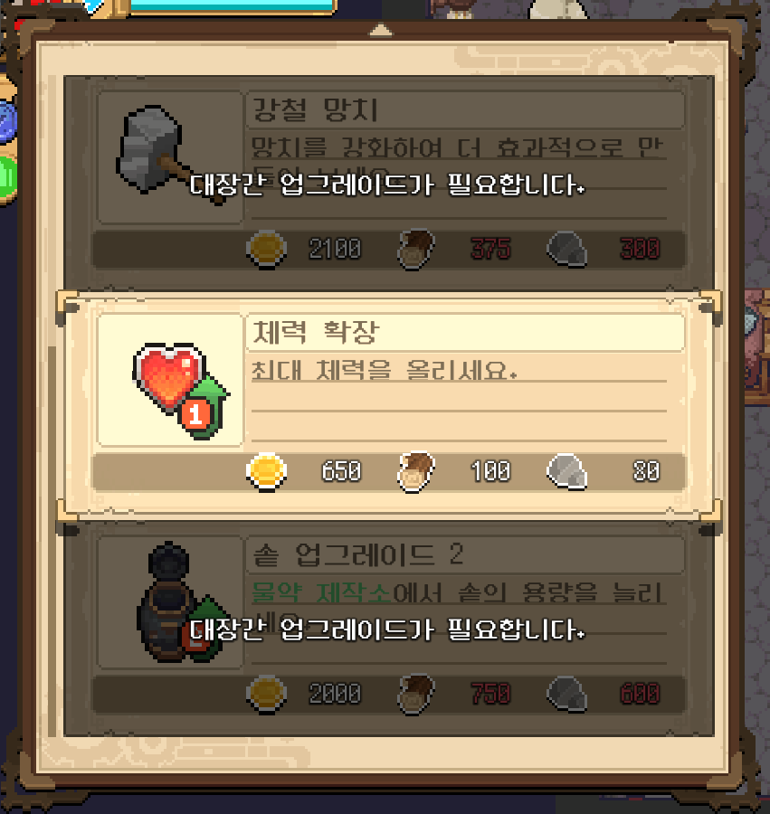 그 외에도 업글레이드 해야 할 것들이 여러 개라서 일단은 솥 업그레이드를 먼저 하기로 결정했습니다.