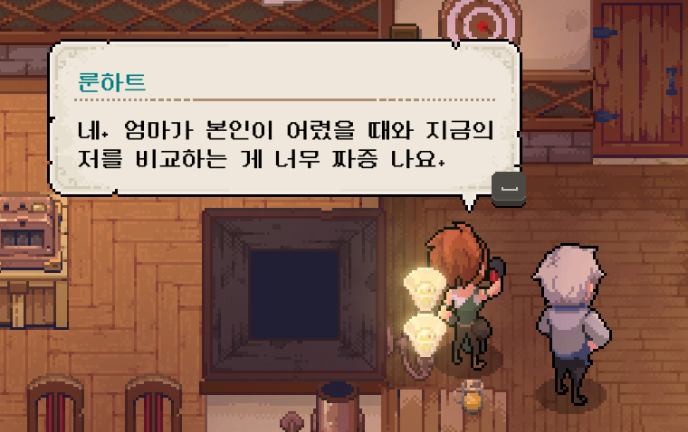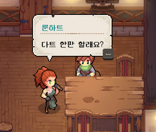 주점에서 NPC '룬하트'를 만났습니다. 다트를 던지면서 자신의 가지고 있는 고충을 들을 수 있었습니다. 아직 우정 레벨이 낮다 보니 막 캐릭터에 대한 엄청난 정보를 주는 것은 아니고 간단한 내용들 위주였습니다.