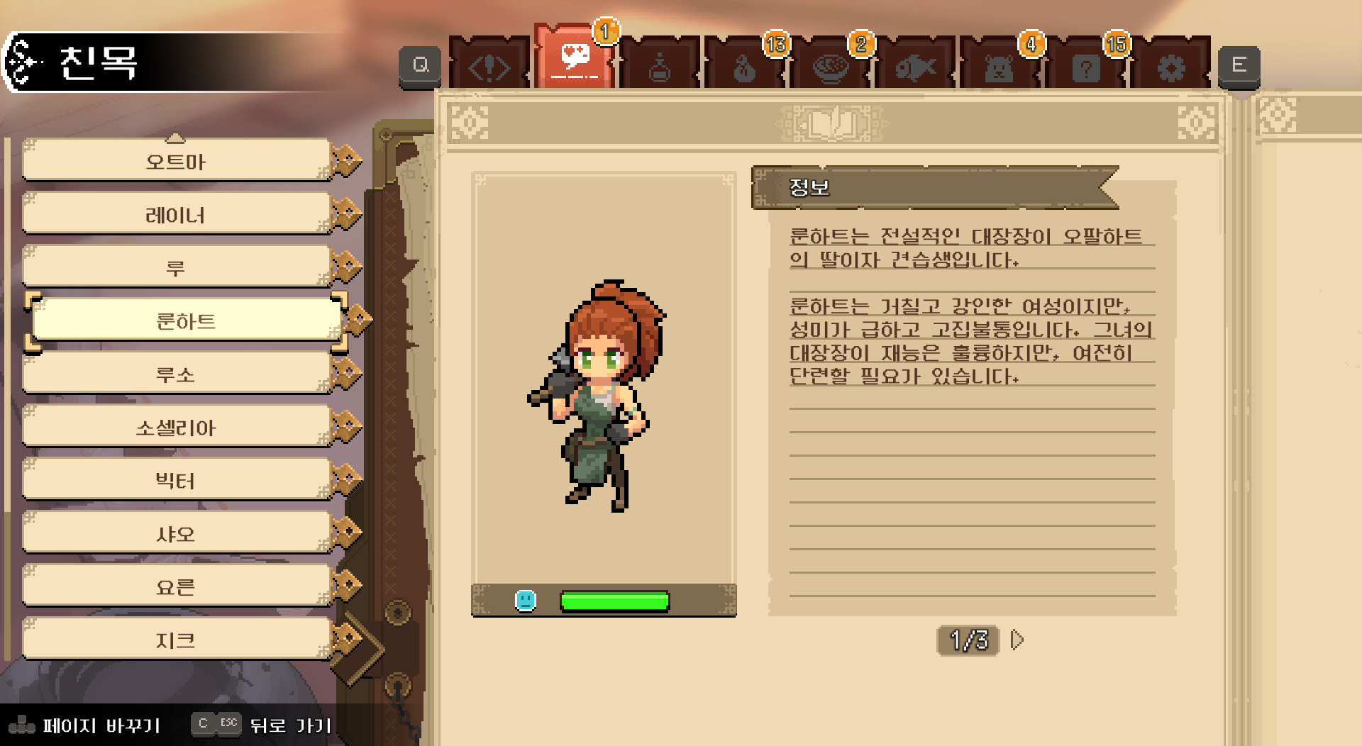 이렇게 '루'의 우정 레벨도 올릴 수 있었습니다. 이런 식으로 마을 사람들마다 각자 소소한 이벤트가 있는 듯 합니다.