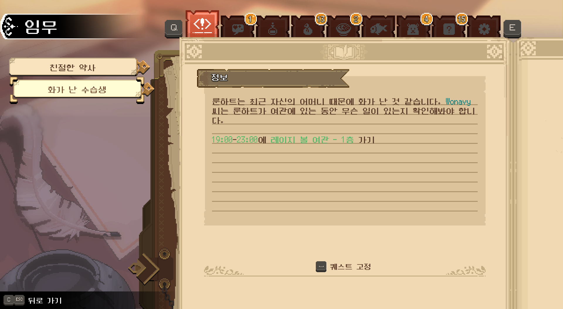 사실 갑자기 우정 레벨을 몰아서 올린 이유는 '친절한 약사' 퀘스트를 받았기 때문입니다. 문버리 주민들과 최소 3명과 친해지라는 내용이었습니다.