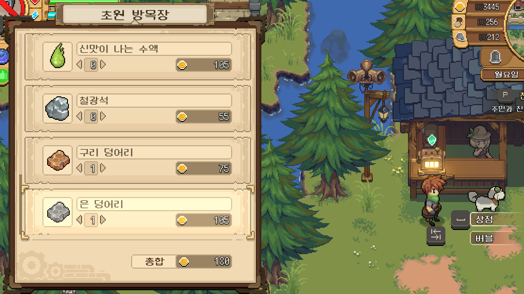 산지기가 운영하는 가게에서 약재 재료들을 구매할 수 있습니다. 이번에는 귀찮아서 그냥 구매를 했지만 생각보다 가격이 비싼 편이라 앞으로는 그냥 스스로 수급을 할 것 같습니다.