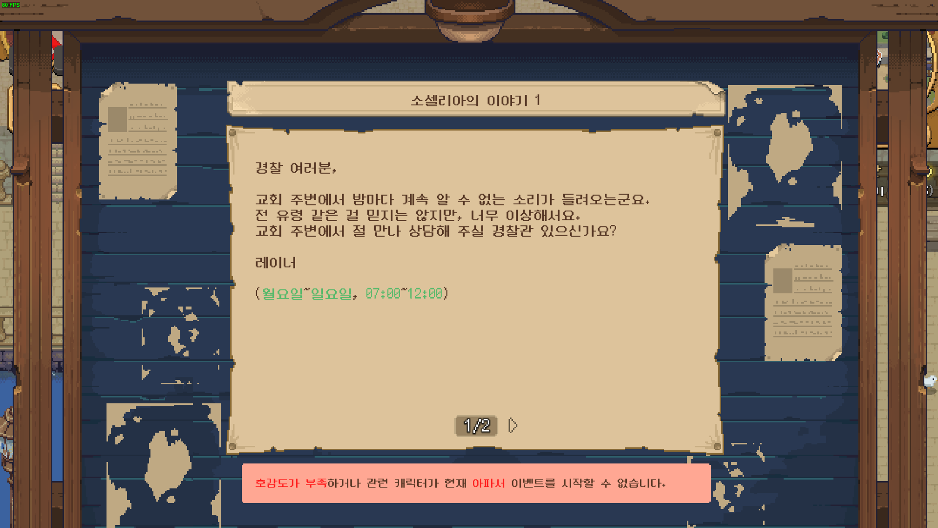각 주민마다 호감도를 꽉 채우게 되면 간단한 이벤트가 발생하게 됩니다. 각 시간에 맞춰 장소를 찾아가게 되면 자동으로 이벤트가 진행이 되더라고요.