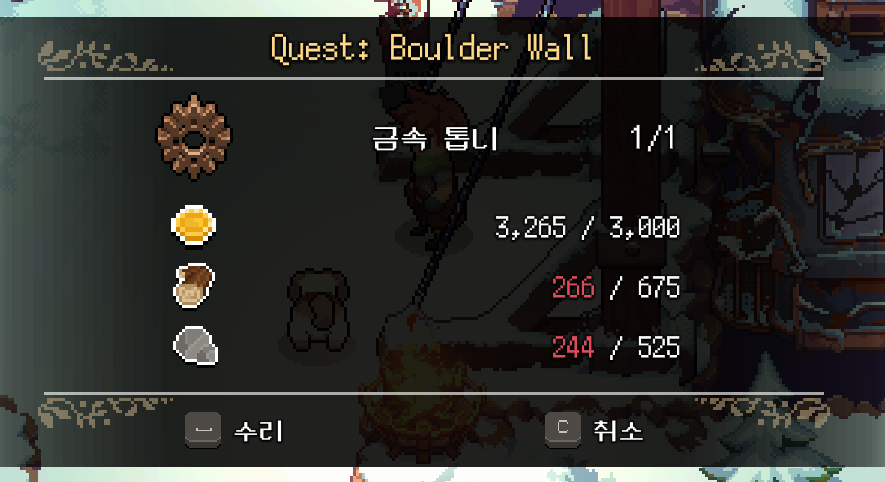 재료를 모두 모은 후 오팔하트를 찾아가 '금속 톱니'를 완성했습니다. 이제 케이블카를 고칠 수 있게 되었지만 아직 목재, 석재가 부족하기 때문에 수리를 하려면 시간이 꽤나 걸릴 것 같습니다.