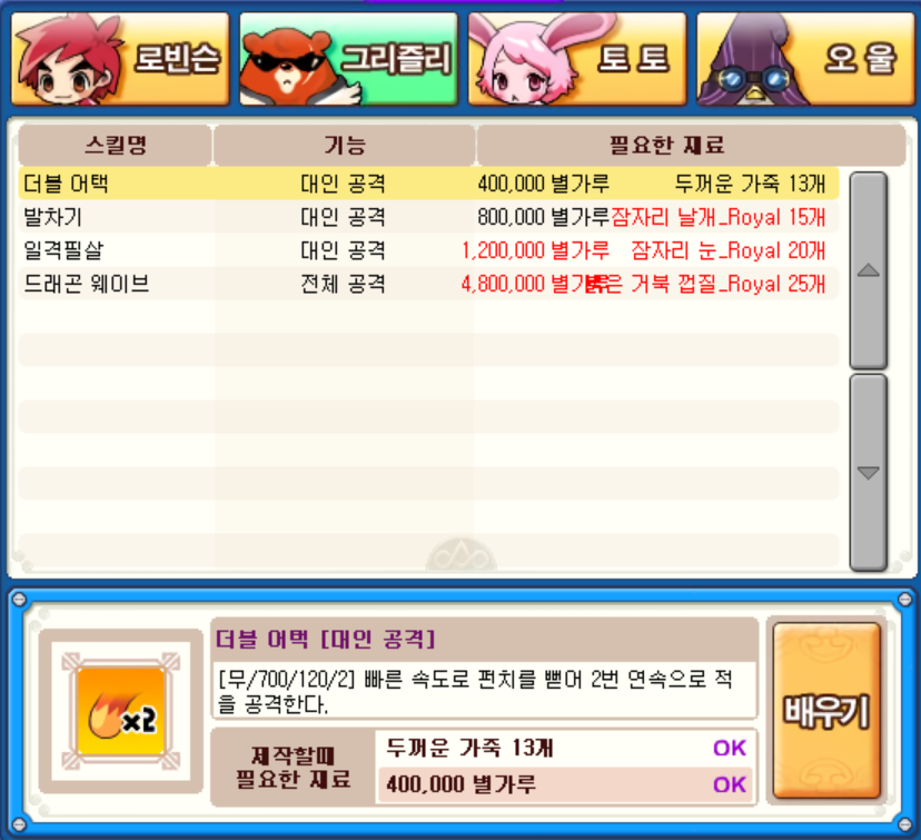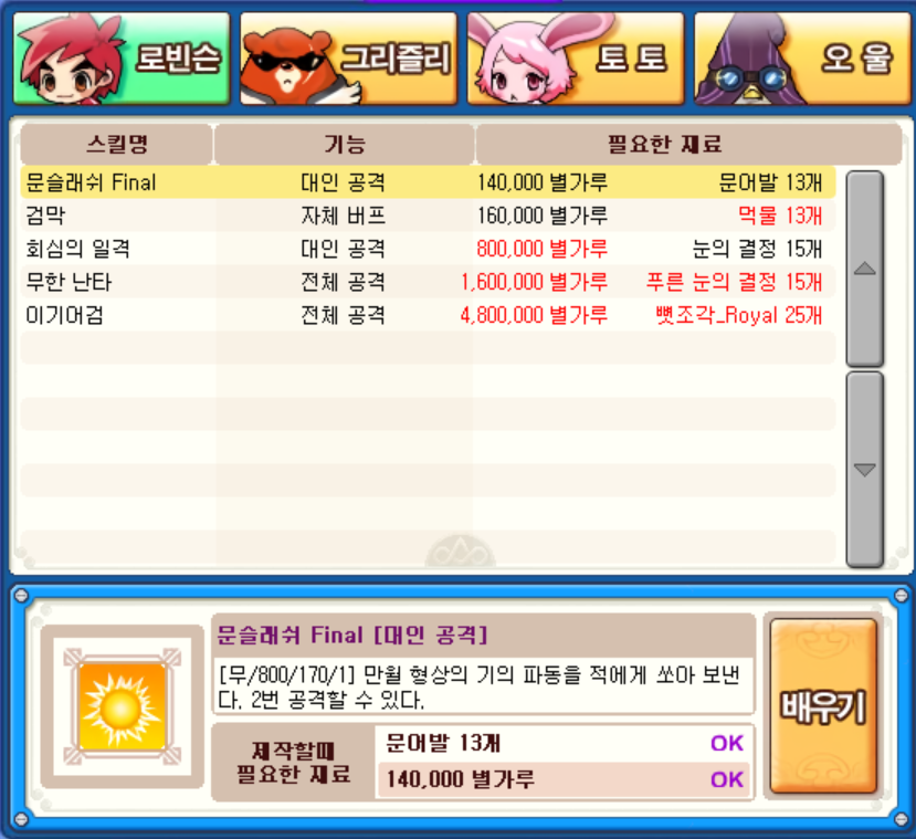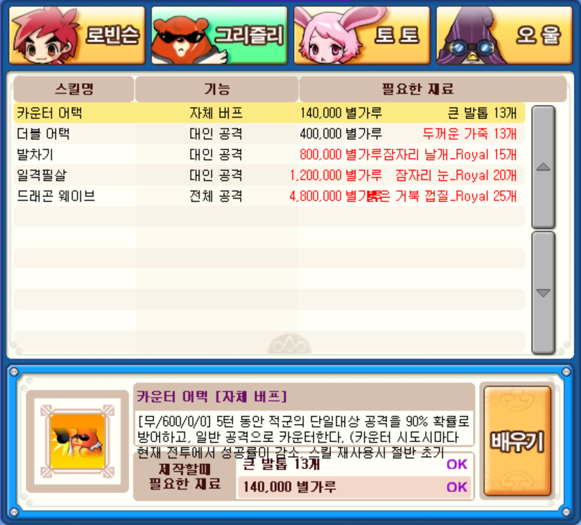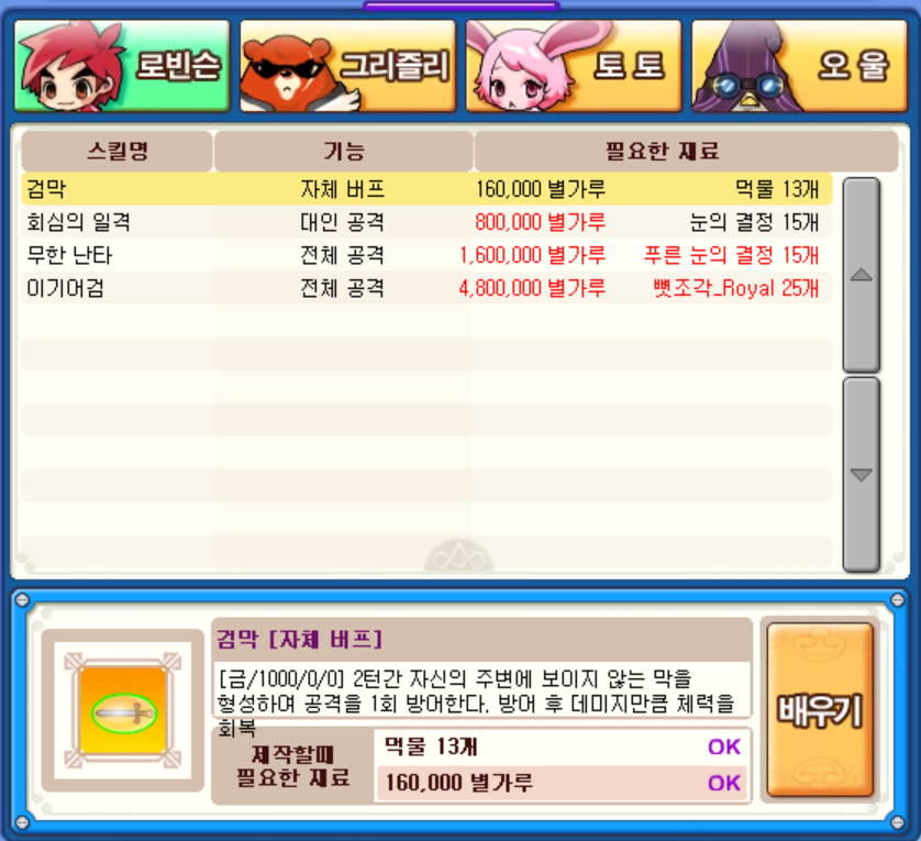 그리고 로빈슨의 '검막' 스킬도 배울 수 있었는데 공격을 1회 방어 후 대미지만큼 회복을 시키는 기술이라 요긴하게 써먹어볼 만합니다.