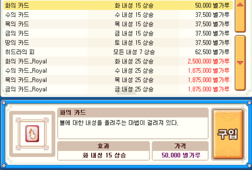 그러면 이제 또 다른 수단이 하나 있는데, 바로 '내성'을 올리는 방법이 있습니다. 아크 데빌은 화속성 공격을 하기 때문에 화속성 내성을 올려주는 카드를 구매해서 장착을 해주었습니다.