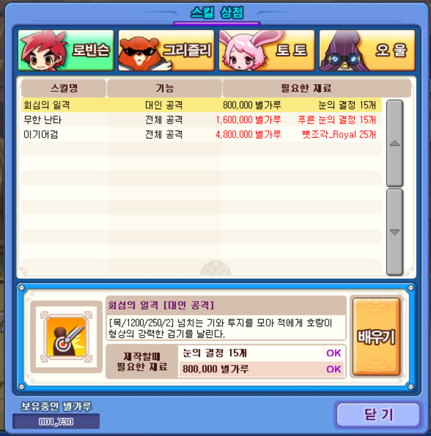 그리고 재료를 모아서 로빈슨 스킬 '회심의 일격'을 배울 수 있었습니다. 강력한 한 방을 날리기 때문에 이 정도면 효과가 있지 않을까 싶습니다.