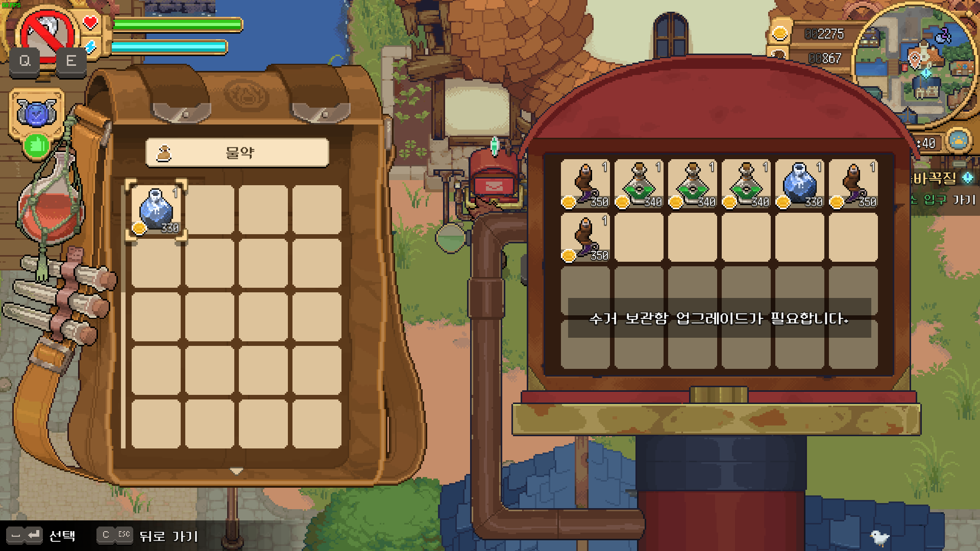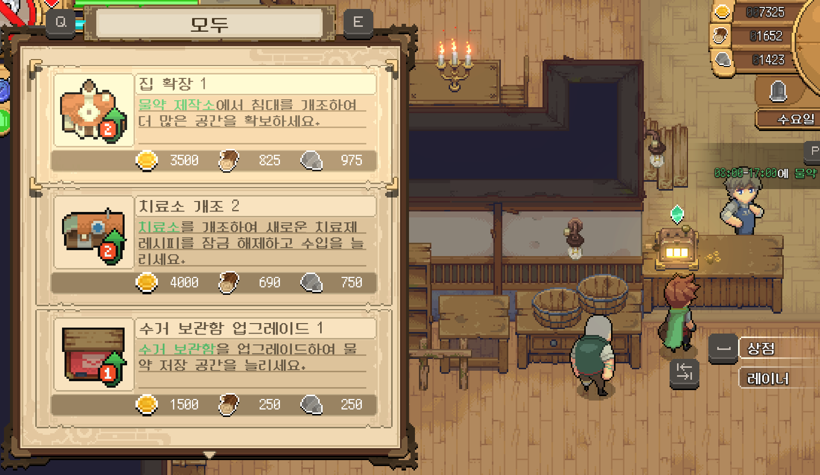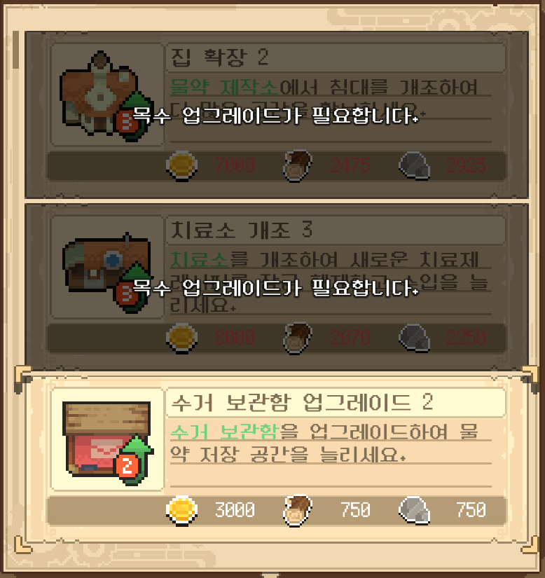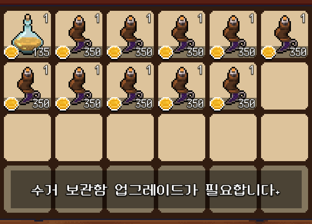 그리고 남는 재료를 모아서 수거 보관함을 한 번 더 업그레이드를 했습니다. 근데 한 번에 물약을 많이 만드는 편이 아니라서 굳이 많이 할 필요는 없는 것 같았습니다.