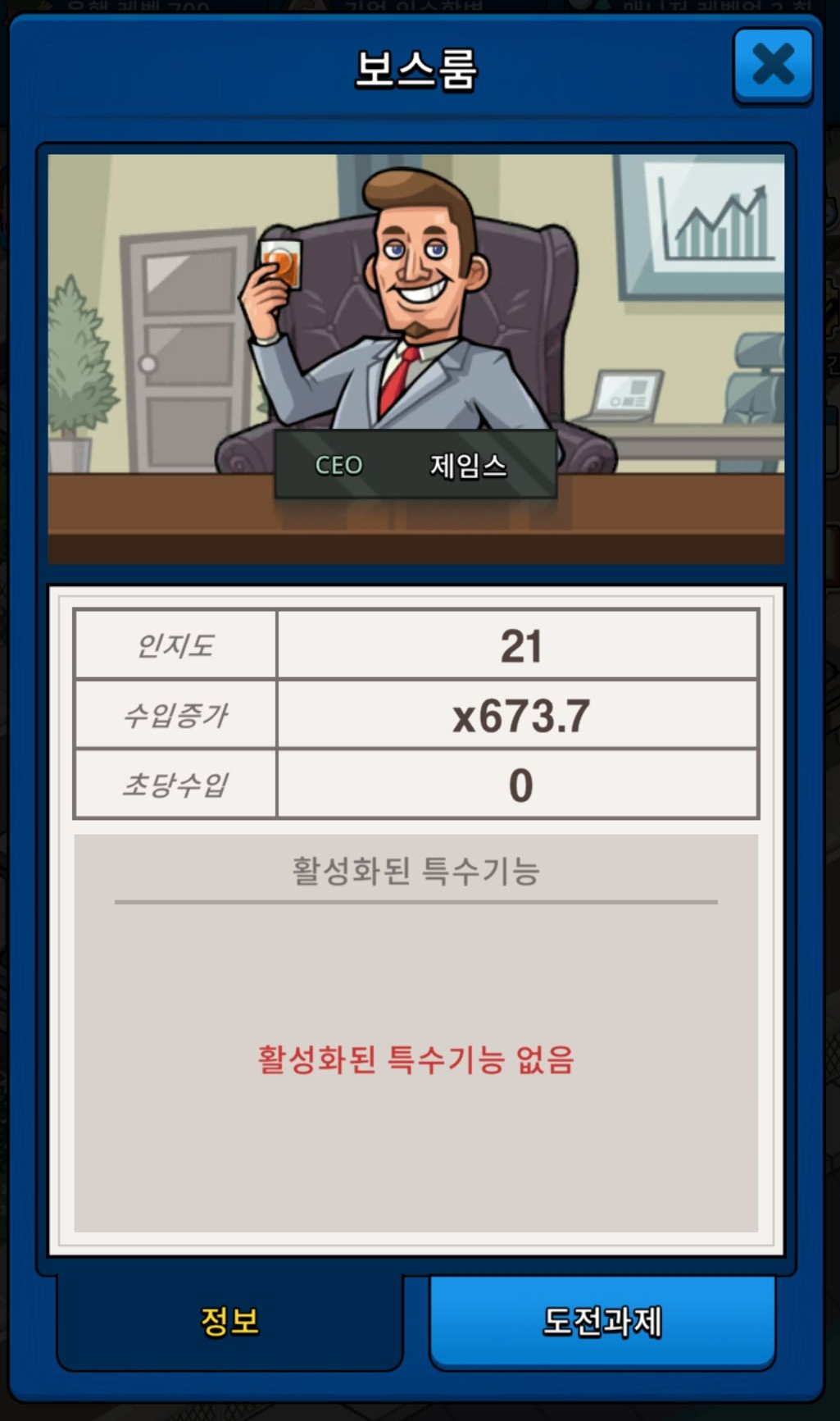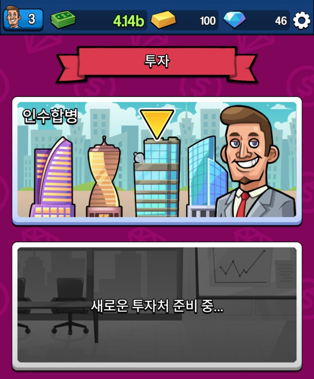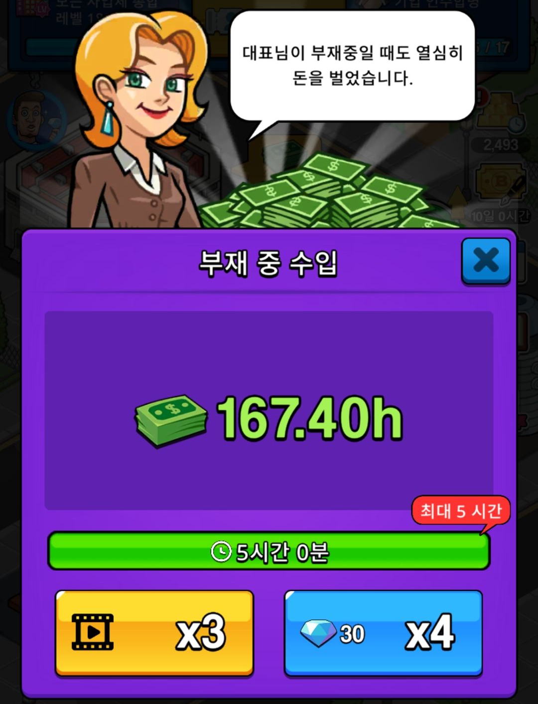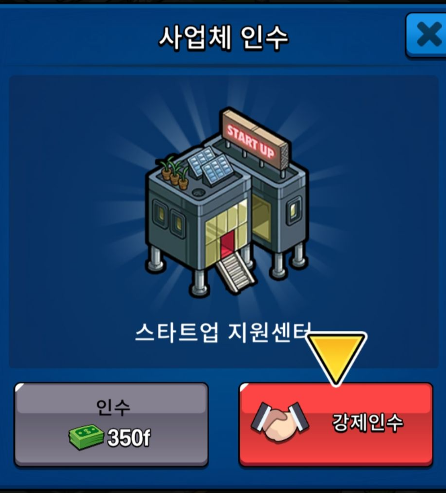 사업체를 인수 후 매니저를 배치를 하면 돈을 벌게 되고, 돈을 수금해 레벨업을 하거나 상위 사업체를 인수 할 수 있습니다.