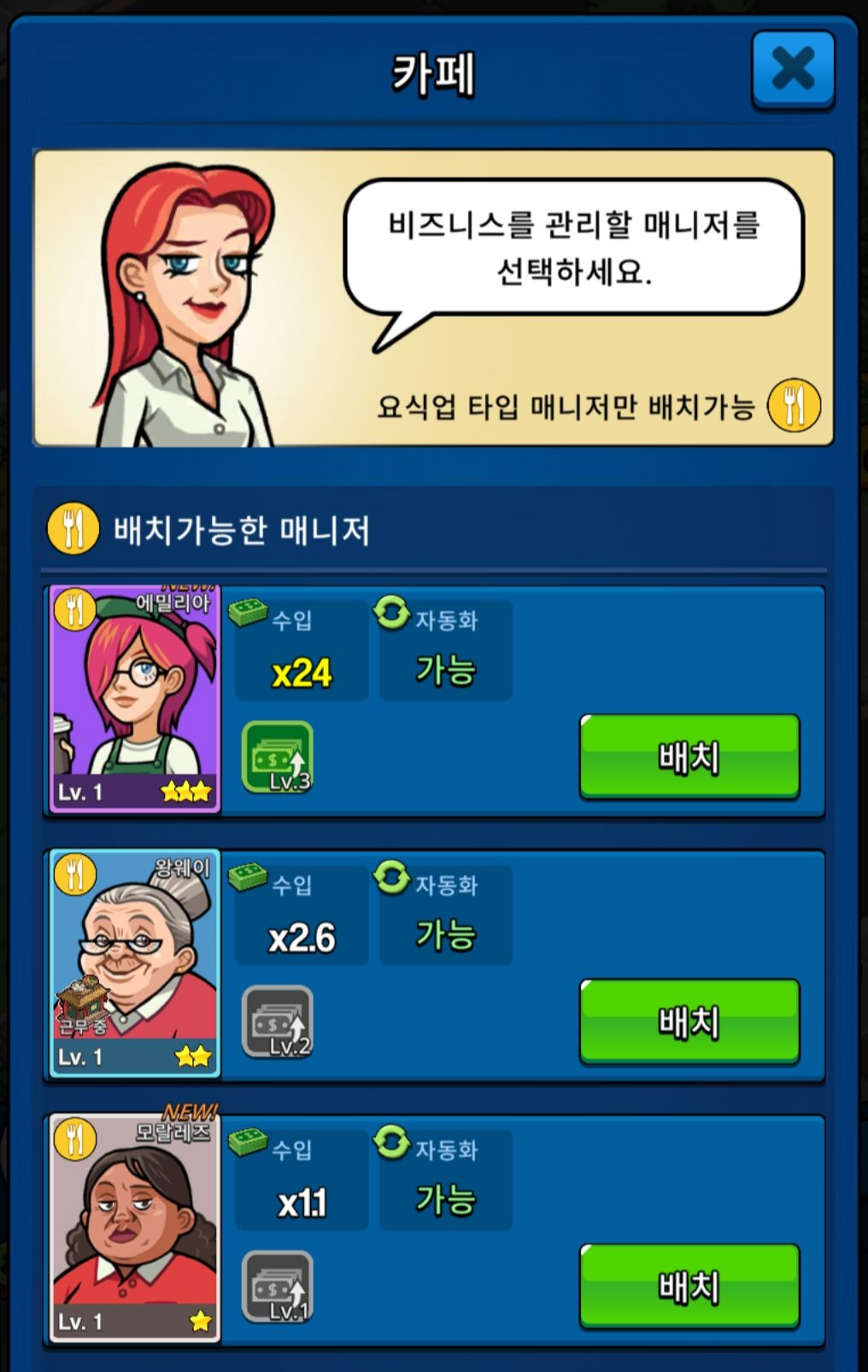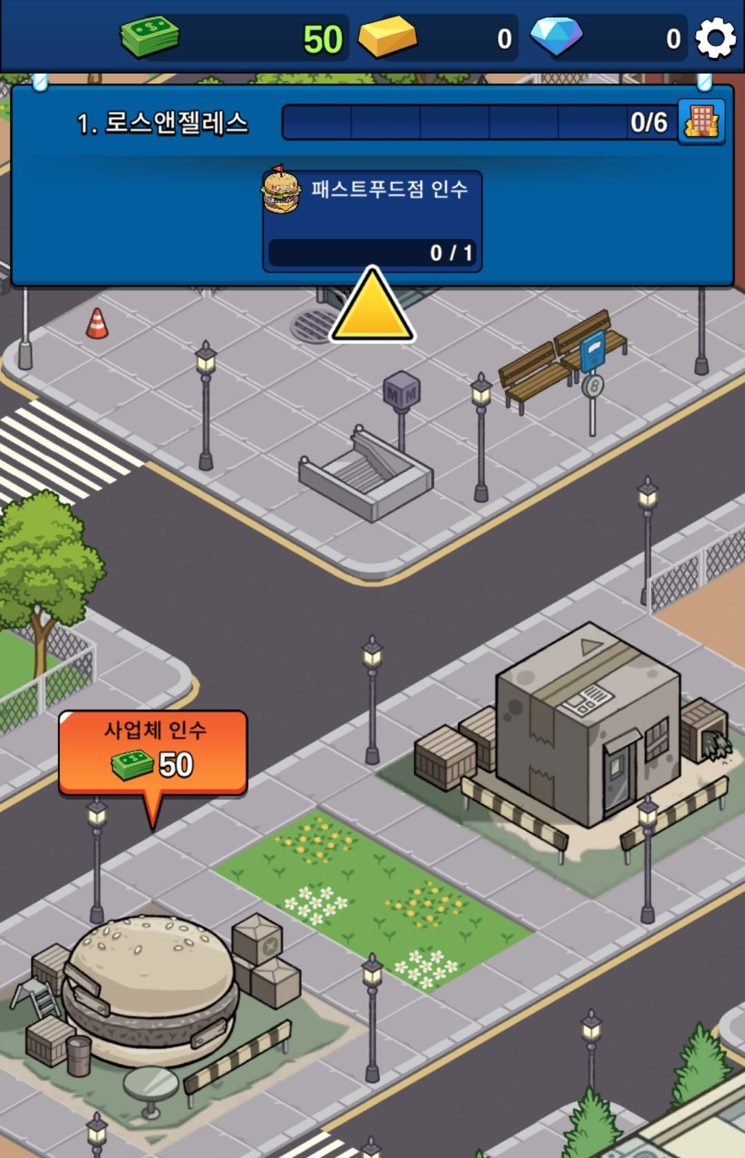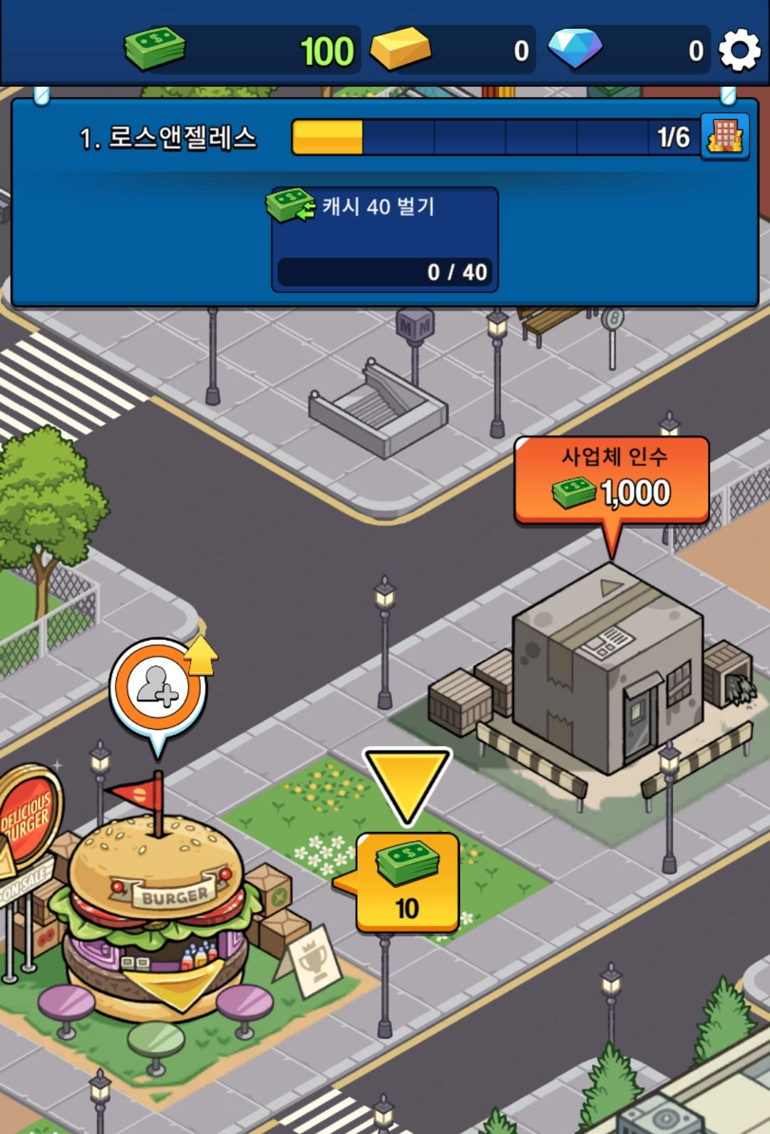 사업체를 인수 후 매니저를 배치를 하면 돈을 벌게 되고, 돈을 수금해 레벨업을 하거나 상위 사업체를 인수 할 수 있습니다.