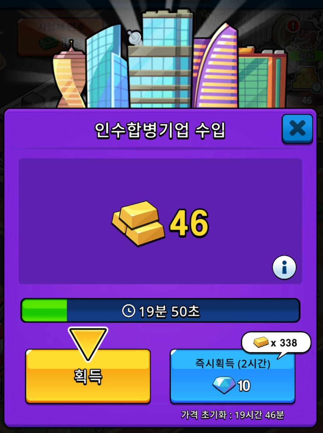 금괴는 '인수합병'을 통해서 획득을 할 수 있었습니다. 협상을 통한 전투 시스템이고 레벨이 올라갈 수록 시간당 얻는 금괴의 량이 증가하게 됩니다.