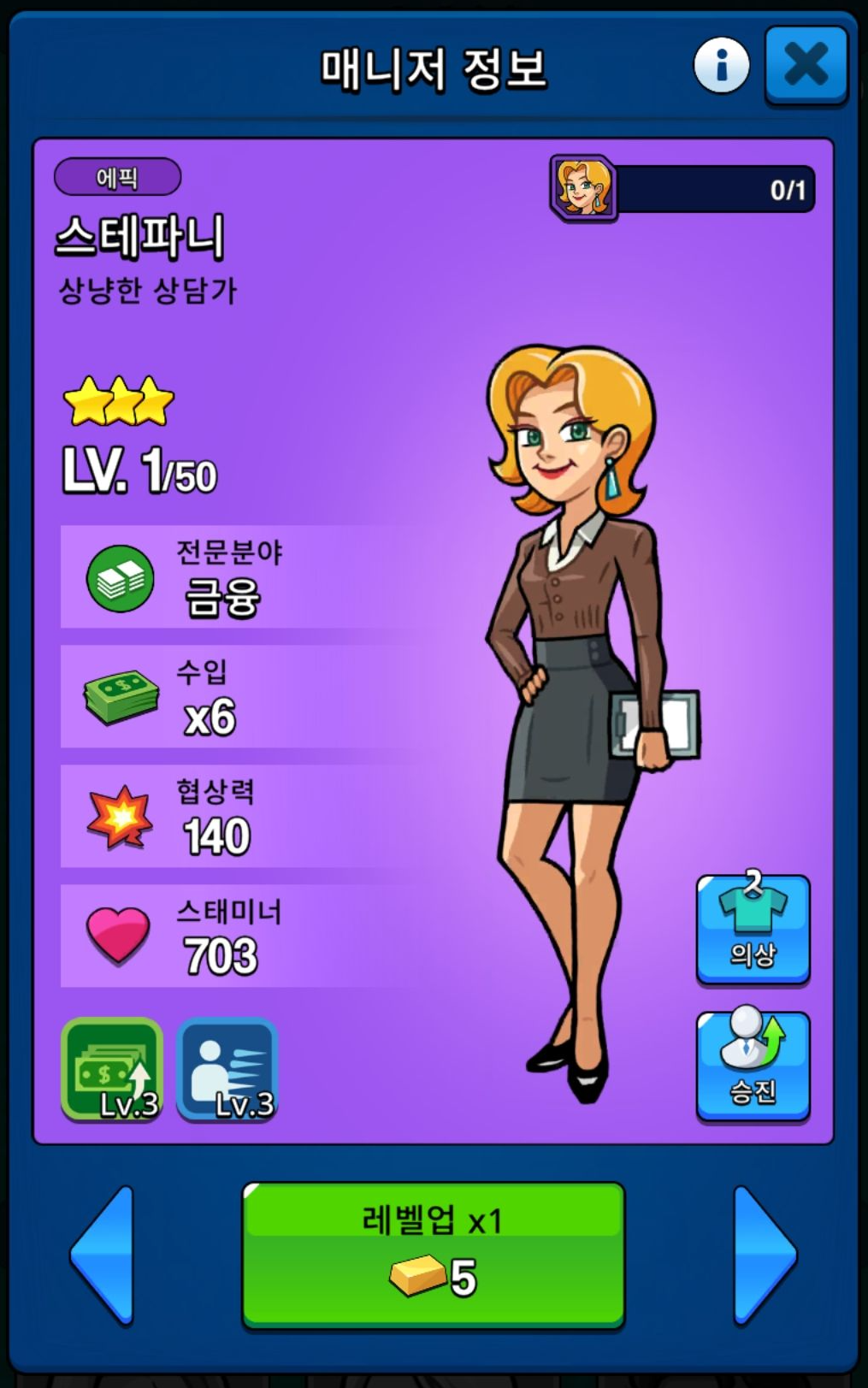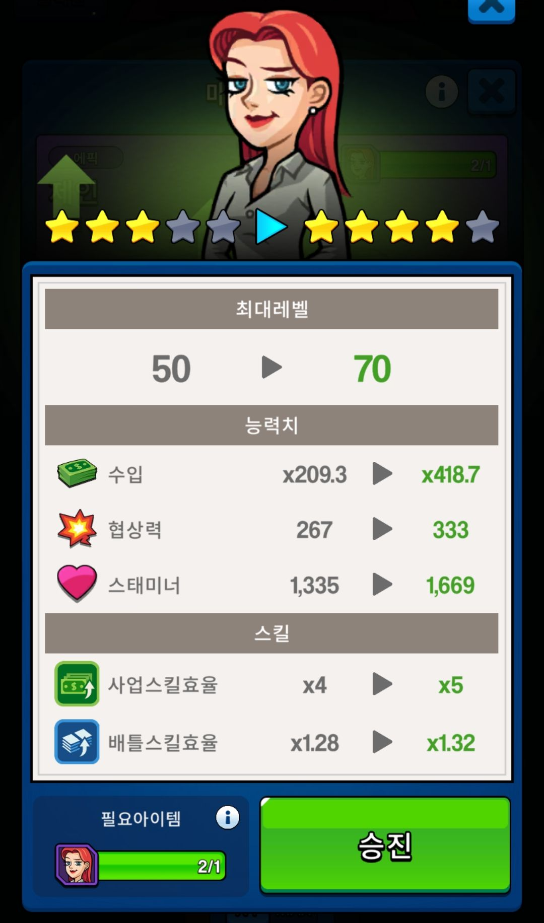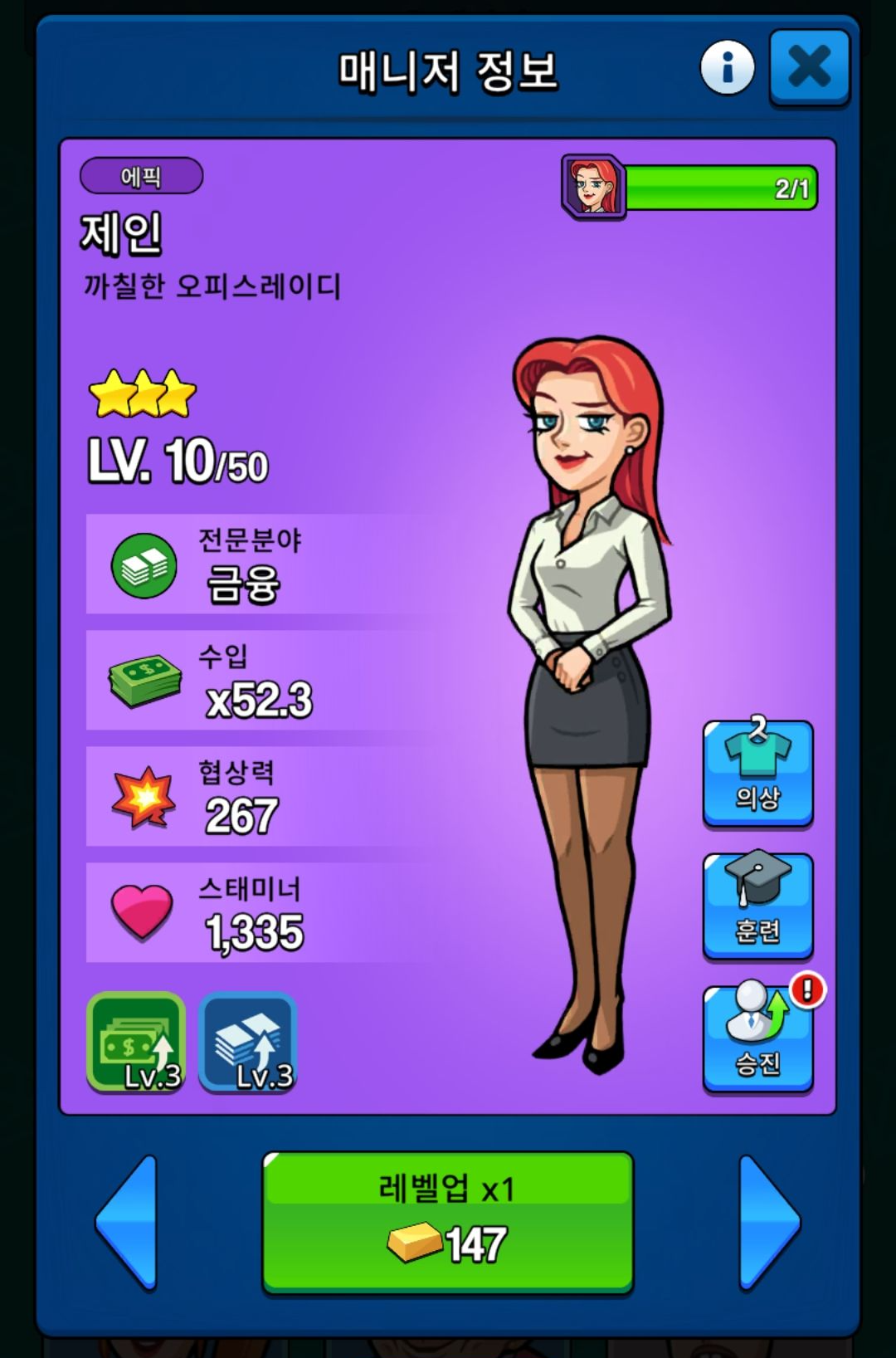 레벨 업을 통해서 사업체 수입 배수를 늘리거나 전투(=협상)를 위한 협상력과 스태미너까지 상승을 하게 됩니다.