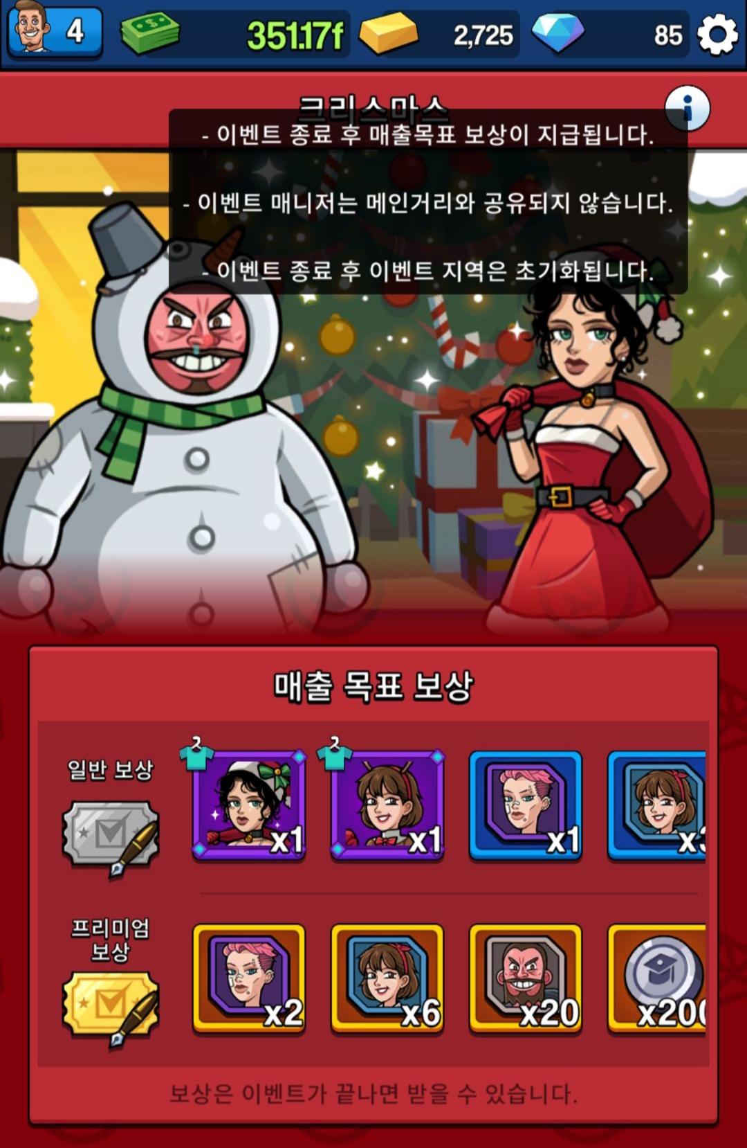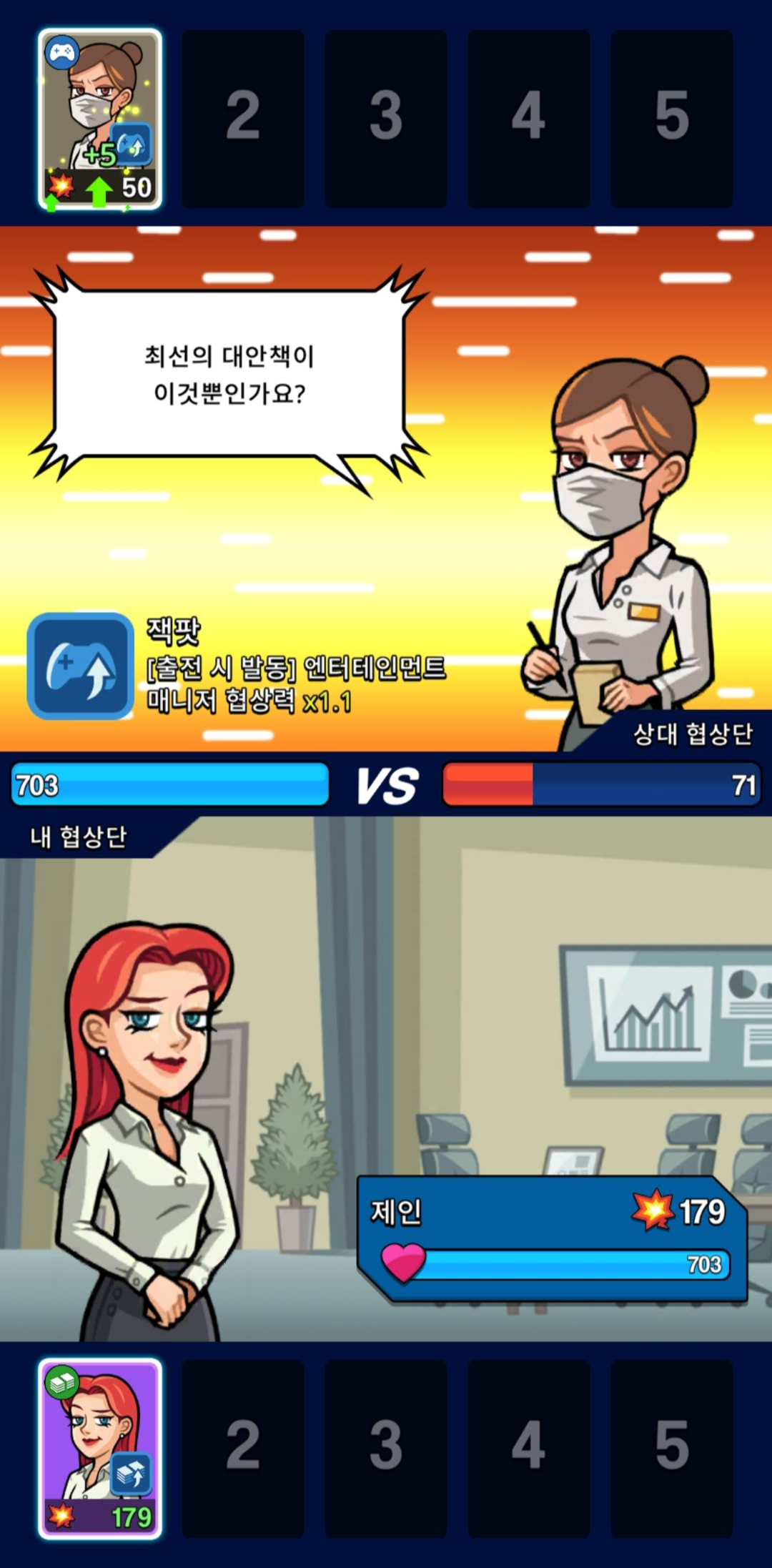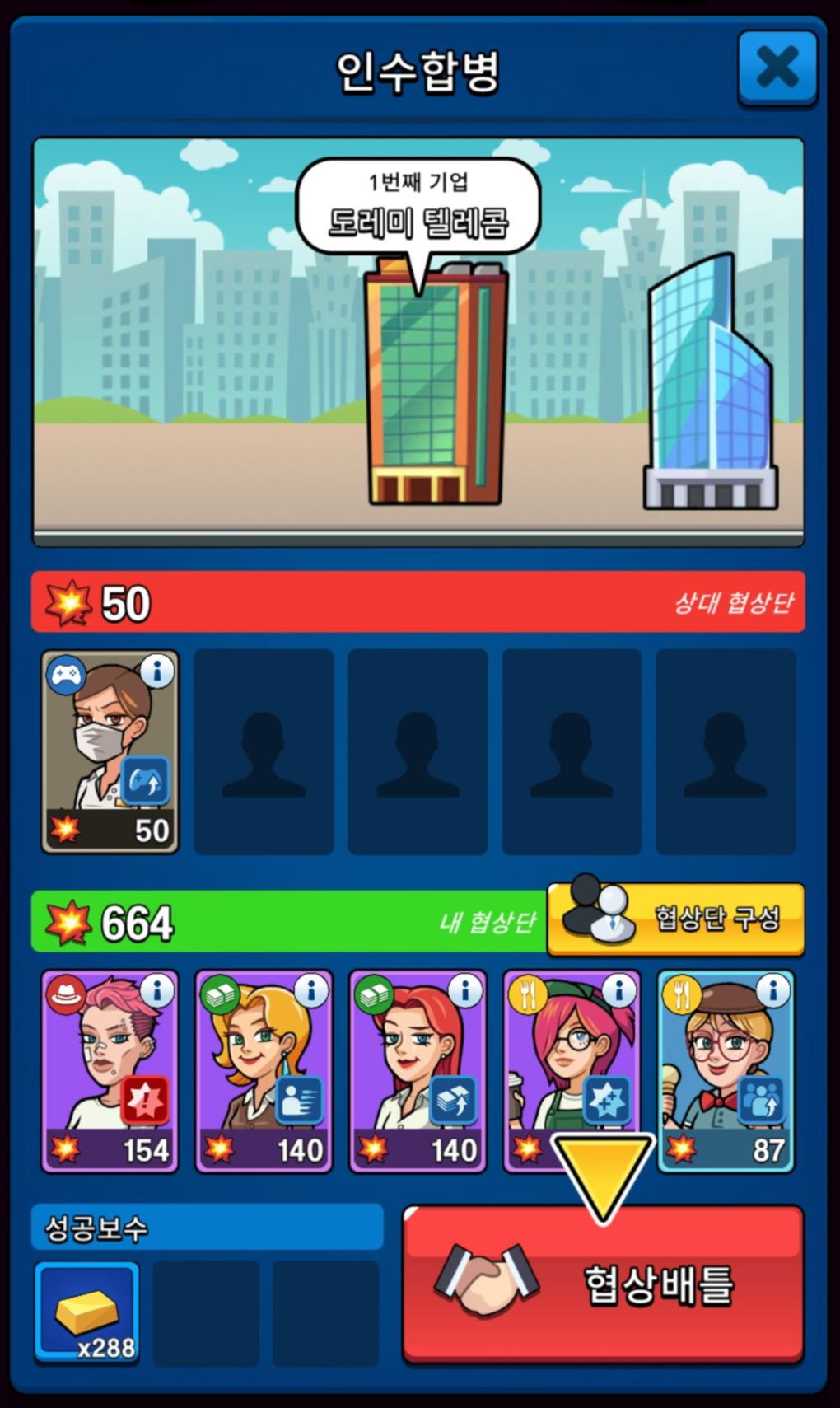 레벨 업을 통해서 사업체 수입 배수를 늘리거나 전투(=협상)를 위한 협상력과 스태미너까지 상승을 하게 됩니다.