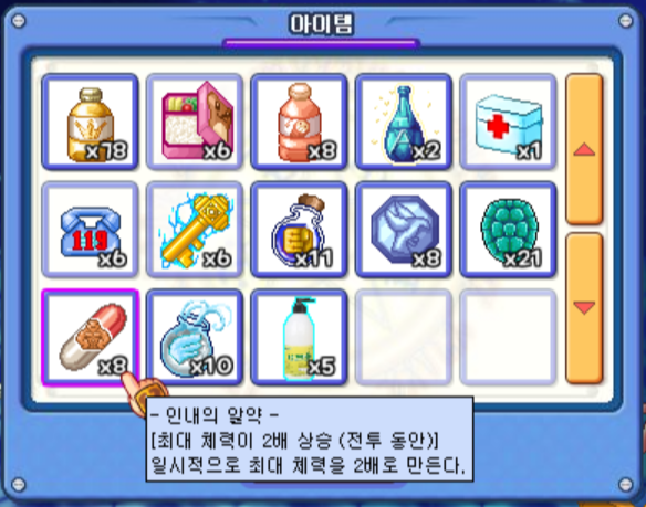 여기서 최대 체력 2배를 올려주는 '인내의 알약'을 사용하기로 했습니다. 그리고 '퍼펙트 힐링'으로 한명 체력을 100%로 채울 수 있기 때문에 꽤나 조합이 좋습니다.