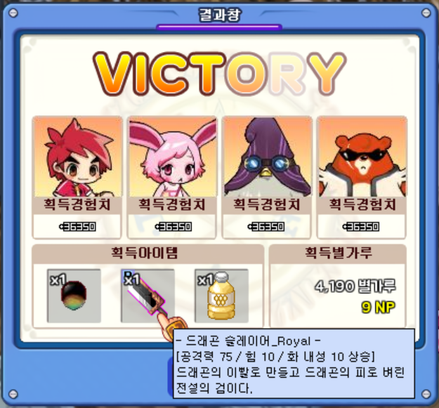 그렇게 코스모스 드래곤을 잡는데에 성공했습니다. 보스 아이템으로 '드래곤 슬레이어_Royal'를 얻었습니다. 공격력이 상당히 높아 바로 로빈슨에게 장착을 해주었습니다.