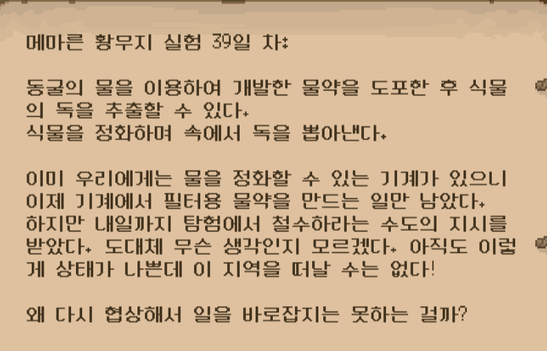오염된 지역을 회복하기 위해 일지를 참고해서 동굴을 가로 막는 돌 앞까지 올 수 있었습니다.