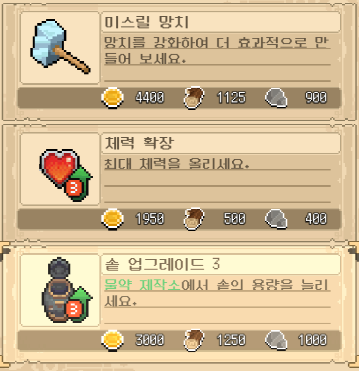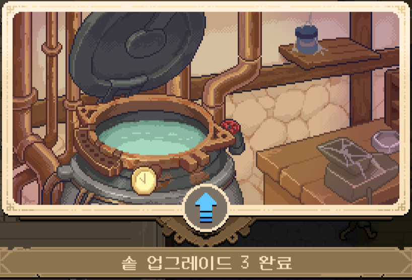 사실 업그레이드는 나중에 몰아서 하려고 했는데, 스토리 진행을 위해서 어쩔 수 없이 모은 재료를 사용해서 솥을 업그레이드를 해주었습니다.