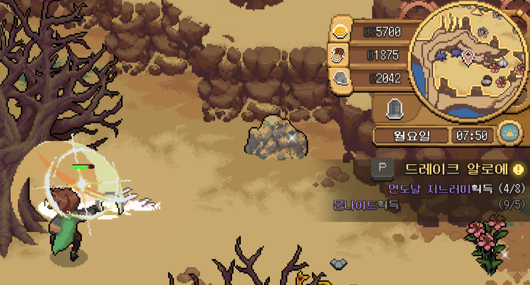 동굴을 가로막는 곡괭이를 만들기 위해서 재료를 모으고 있었습니다. '면도날 지느러미'를 드랍하는 몬스터가 하루에 2마리 밖에 나오지 않아서 생각보다 시간이 오래 걸렸습니다.