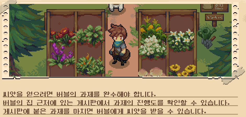 그리고 한 번 얻은 씨앗은 무제한으로 사용할 수 있고, 씨앗을 얻기 위해서는 '버블의 집 근처 게시판'에서 과제를 받아 완수하면 얻을 수 있는 것 같습니다.