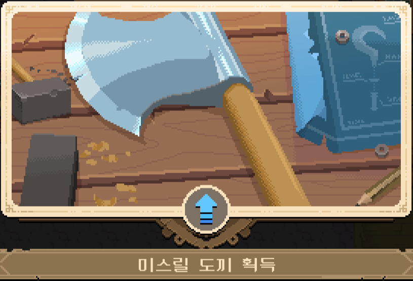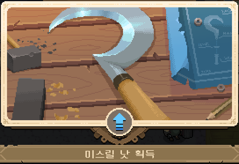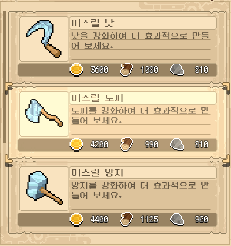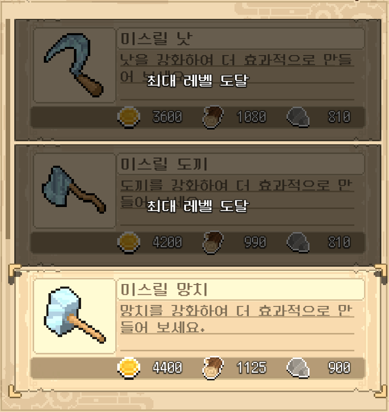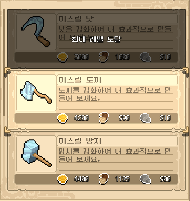 일단 모은 돈으로 낫을 업그레이드를 해주었습니다. 도구는 '미스릴'이 최종 단계이기 때문에 일단 올려주기로 했습니다.