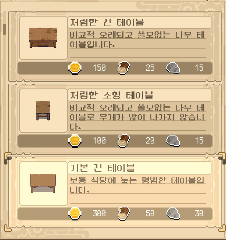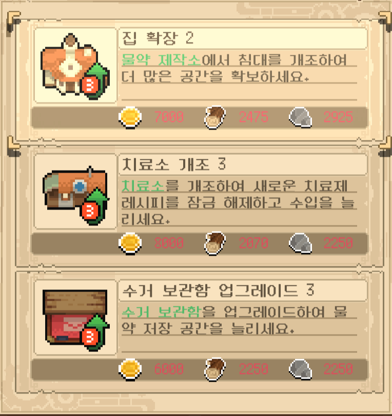 원래 같으면 집, 치료소 업그레이드를 하는 것이 맞지만 남은 재화가 많이 없어서 가구를 제작을 해봤습니다.
