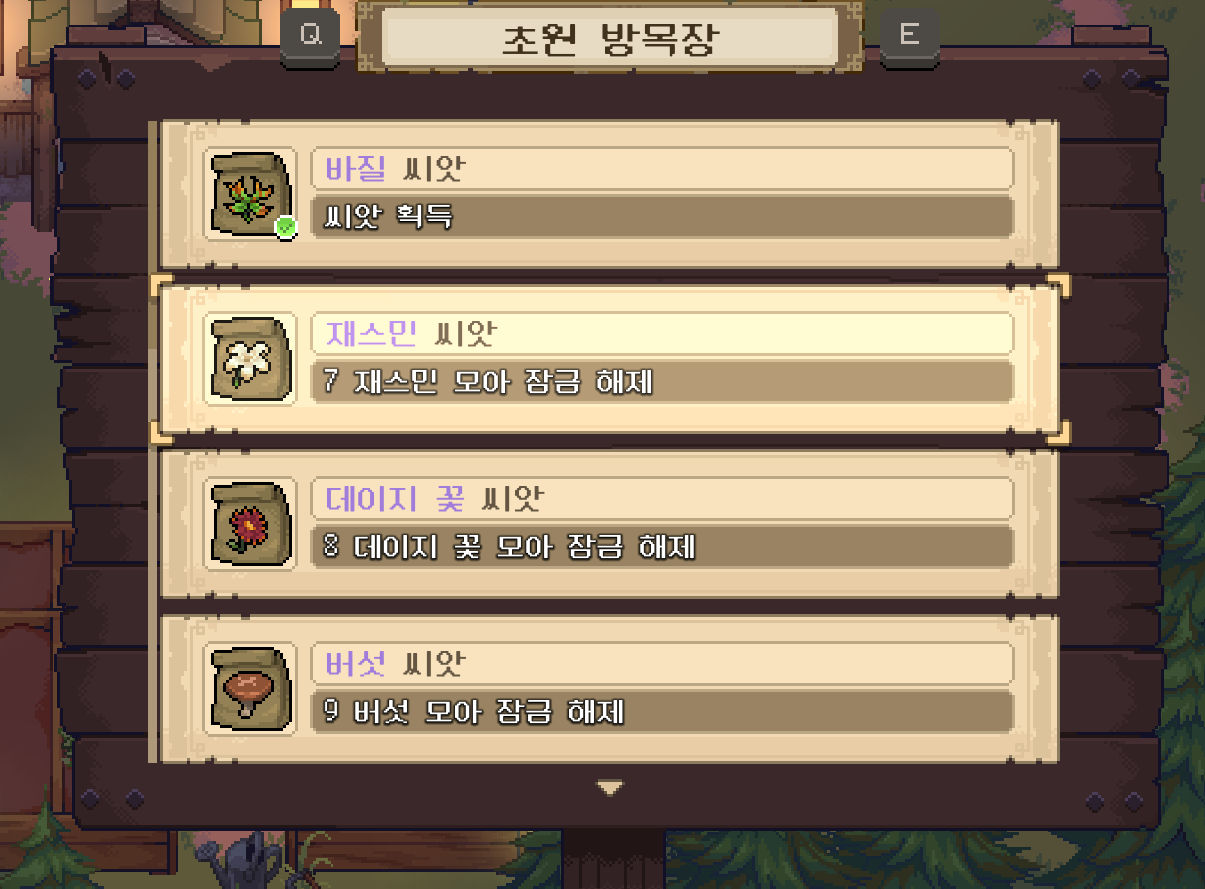 씨앗을 얻기 위해서는 게시판에 있는 퀘스트를 클리어해야 합니다. 위 사진을 보고 재스민 7개를 모으면 해금이 되는 줄 알았으나 그게 아니고, 앞으로 재스민 꽃을 7개 더 얻어야 된다는 이야기였습니다. 전부 해금하기에는 좀 걸릴 거 같아서 씨앗은 다음에 해보도록 하죠.