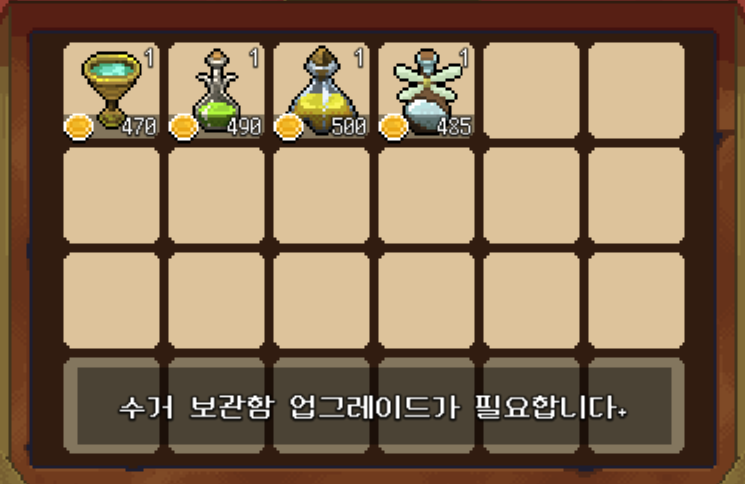 일단은 물약을 몇 개 만들어 봤는데, 생각보다 사용되는 약재가 많아서 많이 만들기는 좀 힘들지 않을까 싶었습니다. 그래도 포션 당 가격을 꽤나 많이 쳐주기 때문에 많이 많이 만들게 되지 않을까 싶네요.