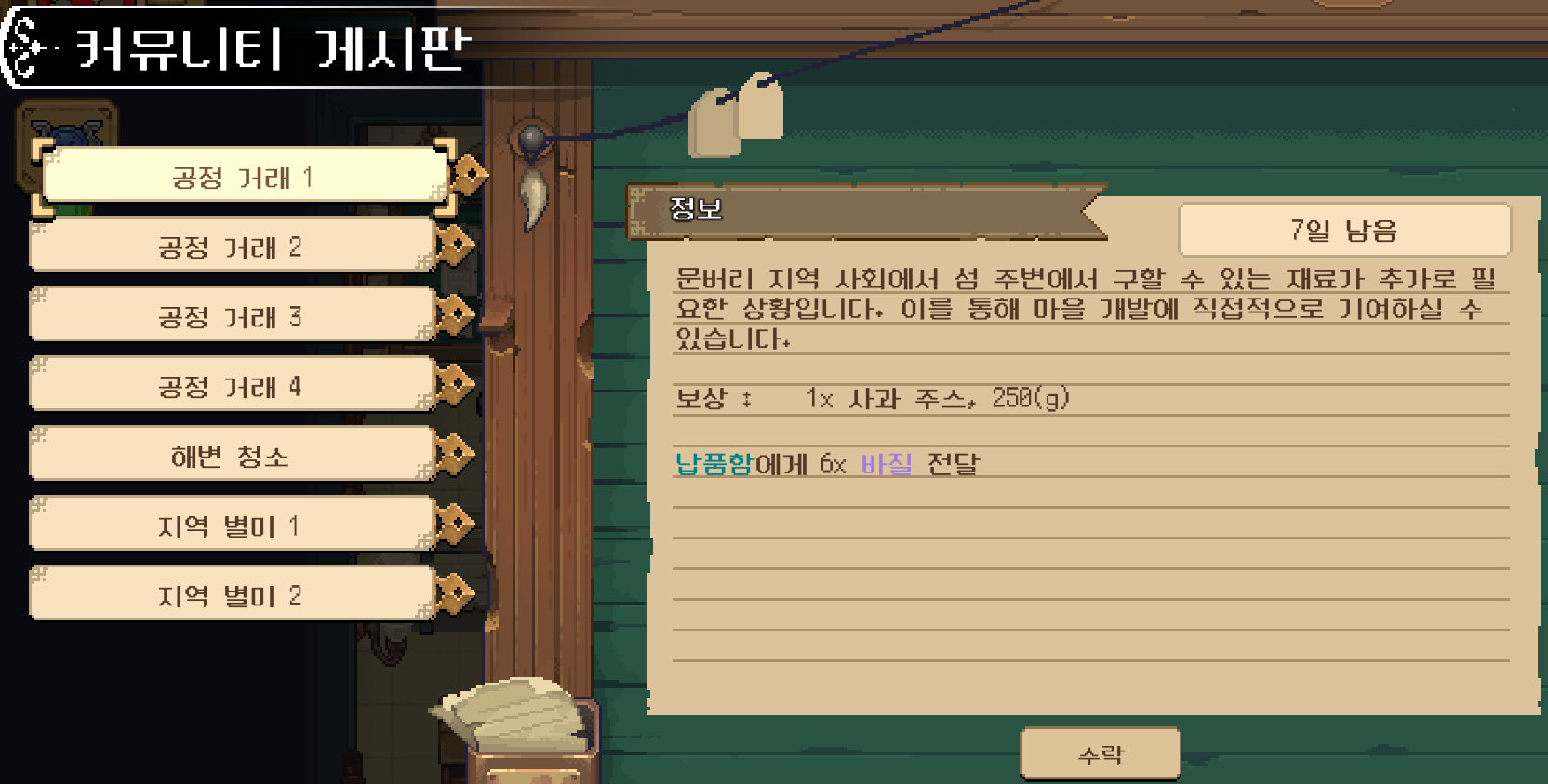 하지만 물약을 만들어서 돈을 버는 것도 약간 한계가 있습니다. 그래서 매주 월요일에 시청에 있는 '커뮤니티 게시판'이 갱신이 되는데 이걸 이용해서 골드를 벌 수 있습니다.