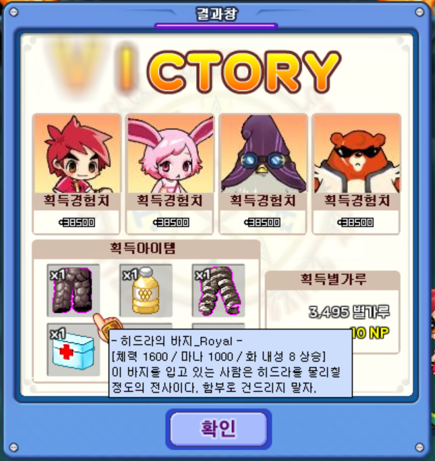 그렇게 보스 아이템으로 '히드라의 바지_Royal'를 얻었습니다. 체력과 마나를 같이 올려주기 때문에 유용하게 잘 사용할 것 같습니다.