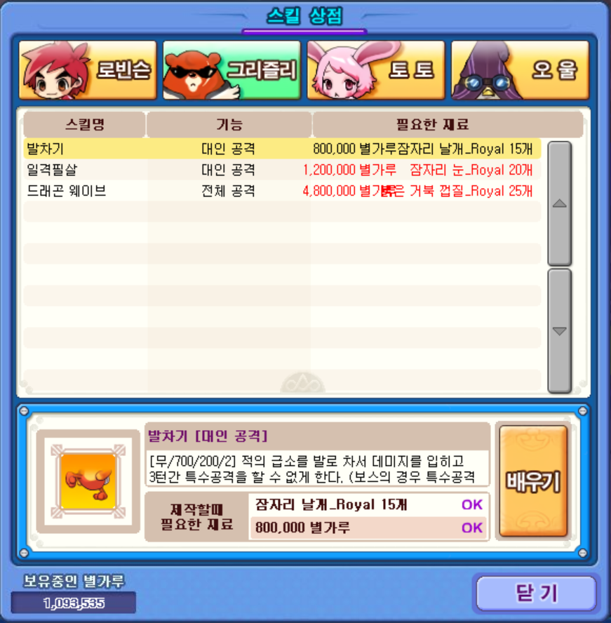 별가루를 모아서 스킬을 배웠습니다. 그리즐리의 '발차기'를 배웠는데 특수 공격을 할 수 없게 만드는 기능이 포함되어 있습니다.